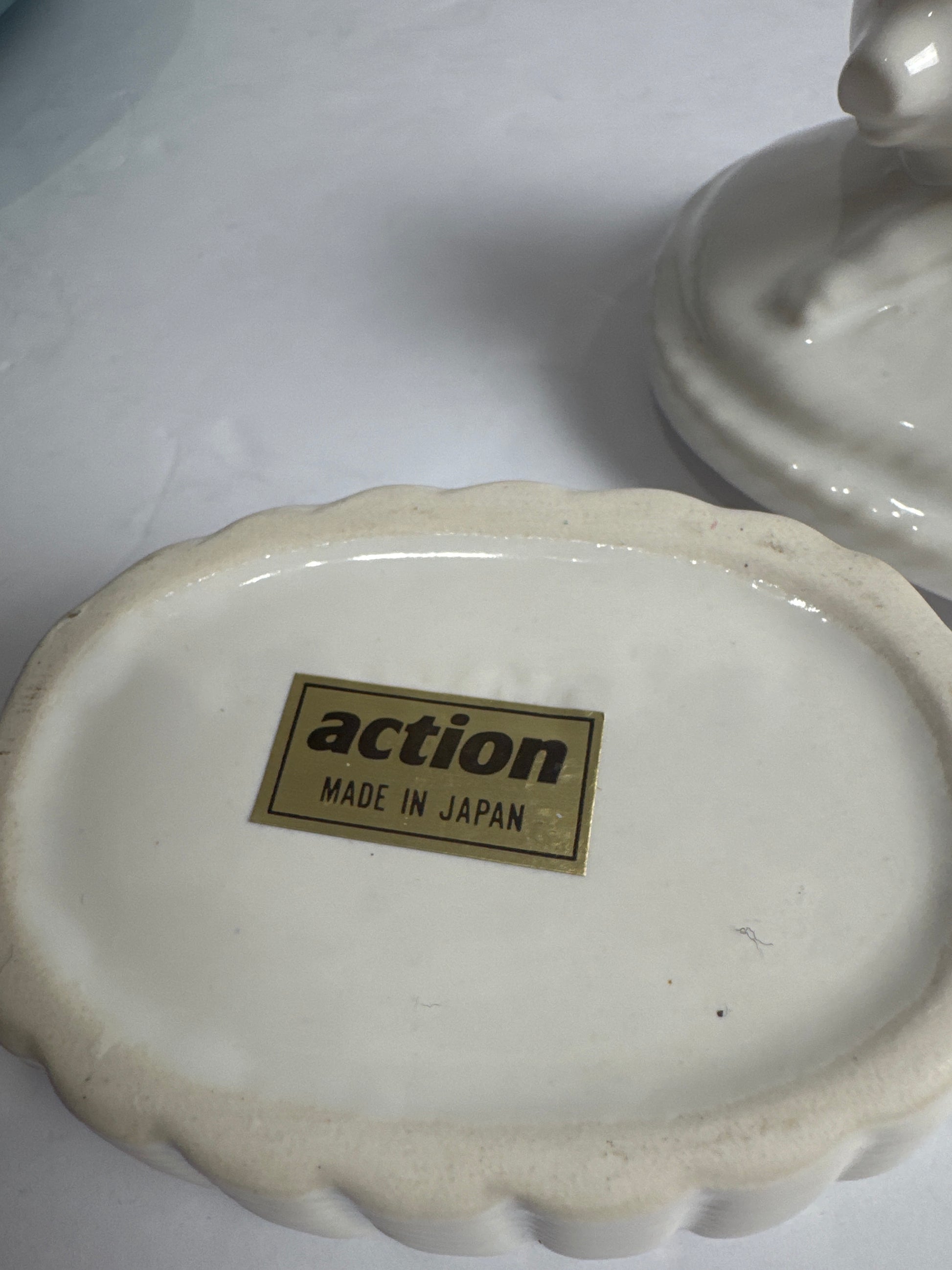 This particular piece, featuring a pig on a basket, aligns with the trend of animal-themed ceramics that gained popularity in the mid-20th century, particularly those produced in East Asian countries like Japan for export. Such items were often mass-produced but still appreciated for their charm and utility in home decor.