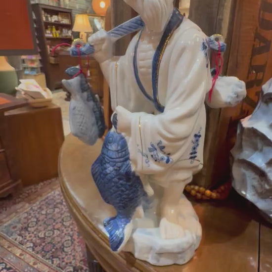 Presenting an exquisite 12-inch East Asian Export Porcelain Longevity Sage, this figure embodies themes of prosperity and good fortune, aligning with revered archetypes such as Shoulao (the God of Longevity) or the Japanese deity Ebisu. The high-quality ceramic boasts a brilliant, pure white body finished with a lustrous glaze, upon which permanent underglaze cobalt blue decoration defines the floral patterns on the robes and the scales of the fisherman’s bounty. The detailed sculpting captures the sage's wise, bearded countenance, who stoically carries his yoke with prized fish—including a large, rich dark blue specimen—suspended by fine red cord. Crucially, the figure is in excellent display condition, with the fragile carrying pole and all intricate attachments remarkably intact, positioning it as a highly desirable and aesthetically powerful centerpiece for the discerning collector of world ceramics.