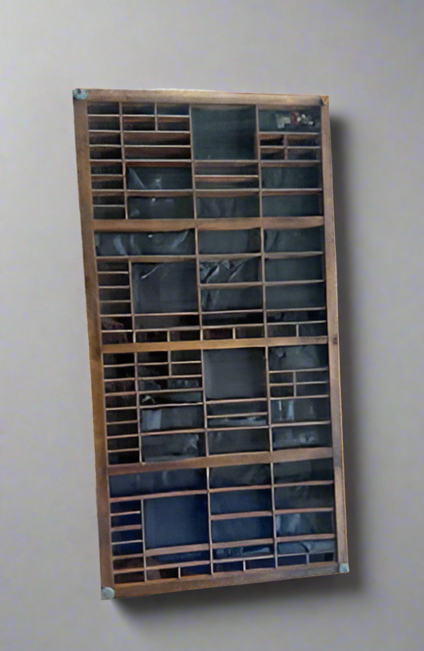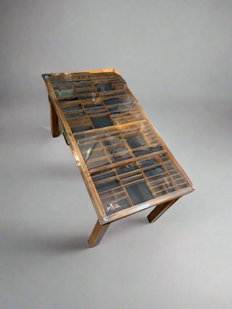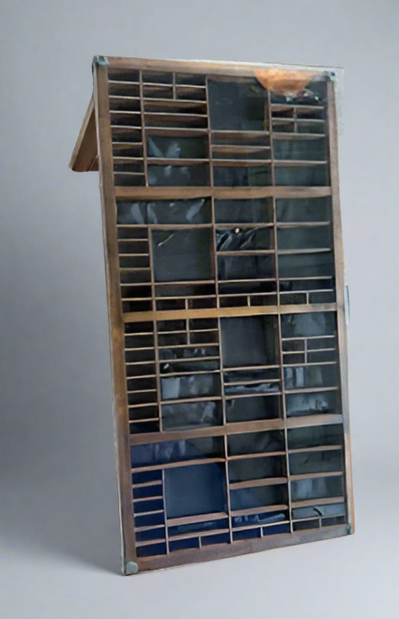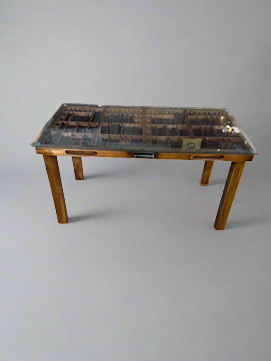 Table with removable glass top providing access to letter press tray. Hamilton Manufacturing Company type wood printers typeset drawer letter press printer tray curio shelf.
