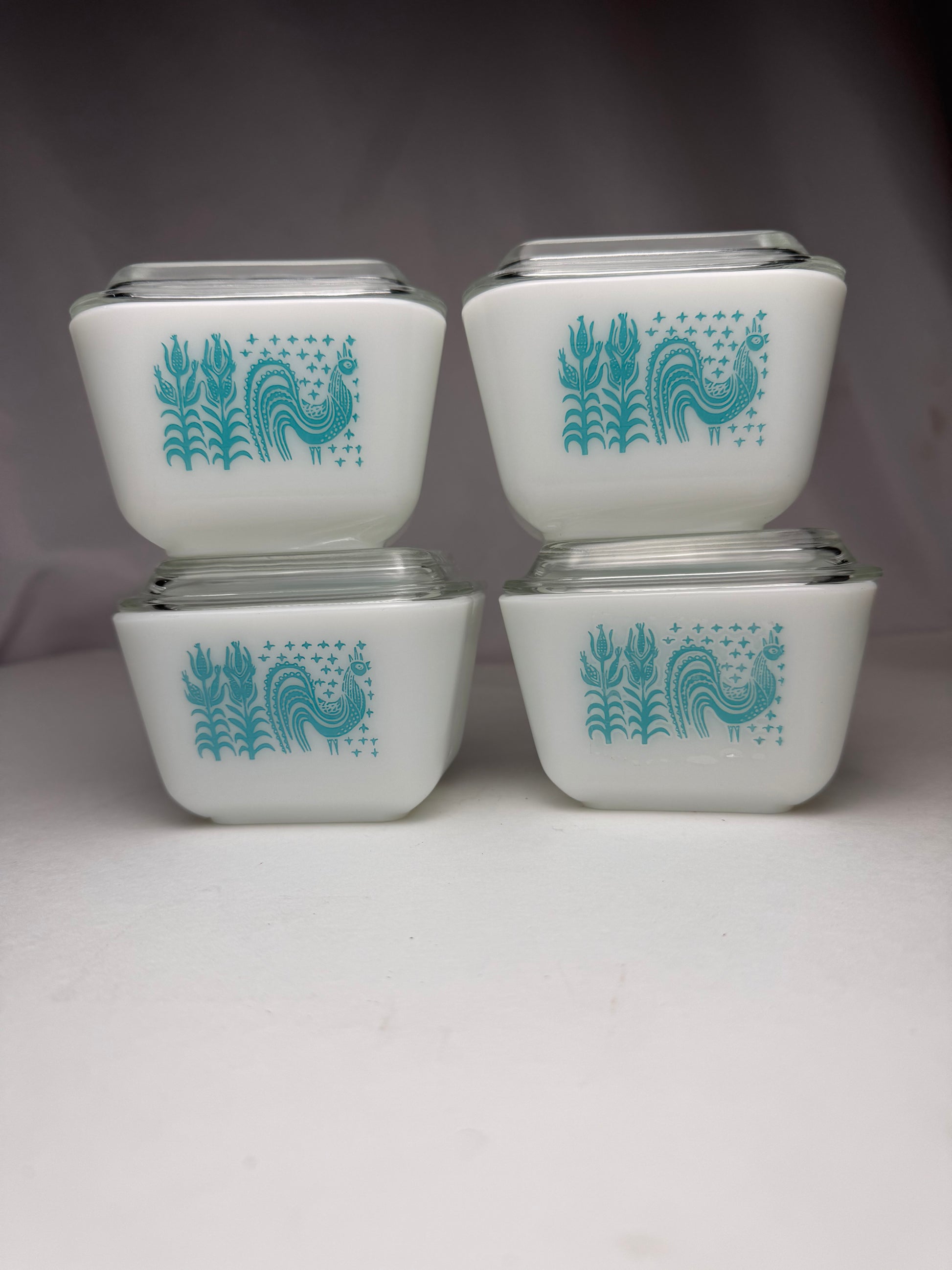 Discover a true gem of American kitchen history with this stunning, complete set of vintage Pyrex in the "Early American" pattern. This classic design, produced from 1962 to 1971, is a favorite among collectors for its charming folk-art motifs featuring roosters, corn, and fruit baskets. The set showcases the highly sought-after blue pattern on a brilliant white opal glass, a more unique and eye-catching variation than the common brown or gold versions.