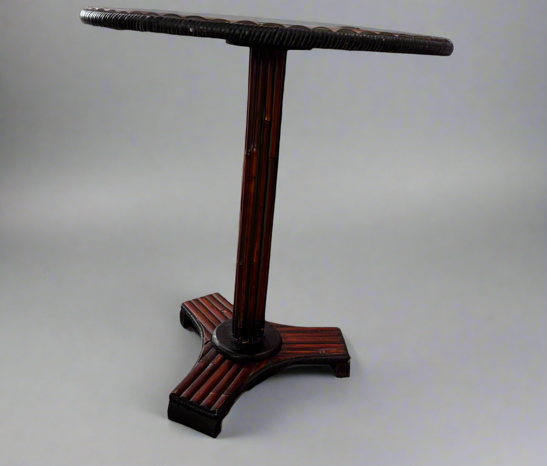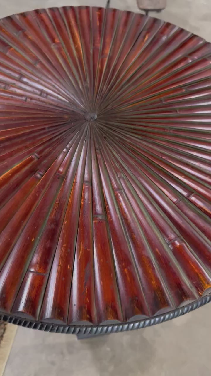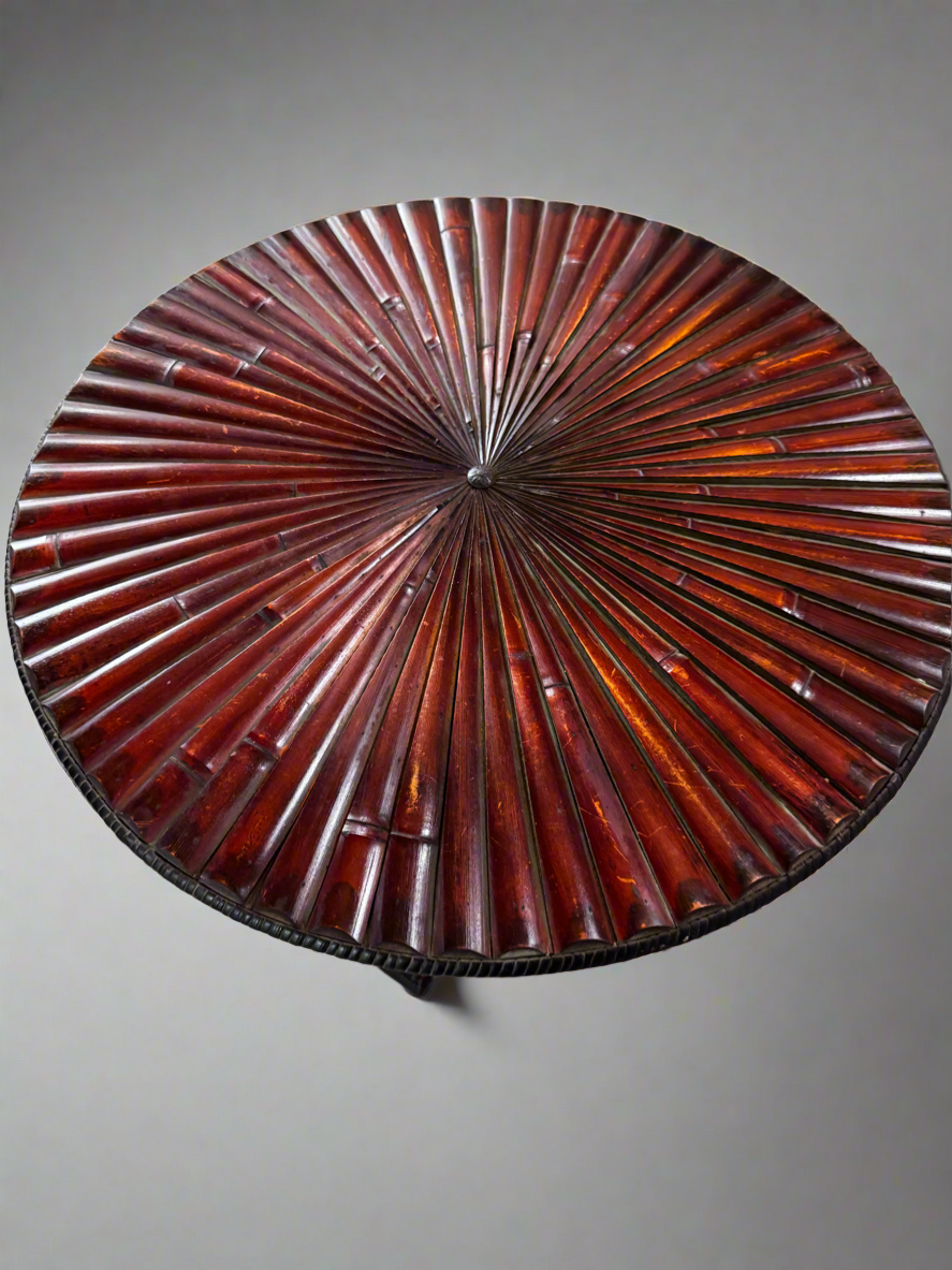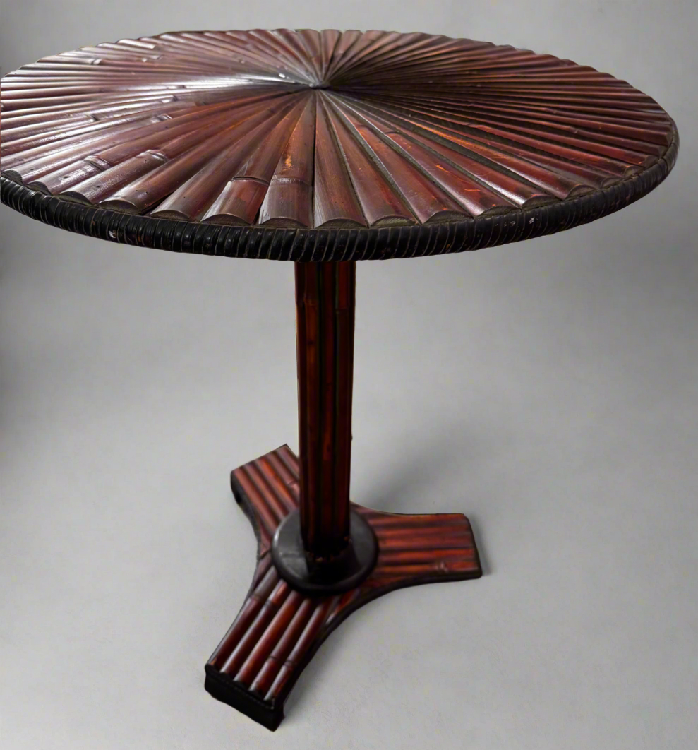 This vintage dark-stained reeded wood table features a striking radial sunburst top and a sturdy pedestal base.