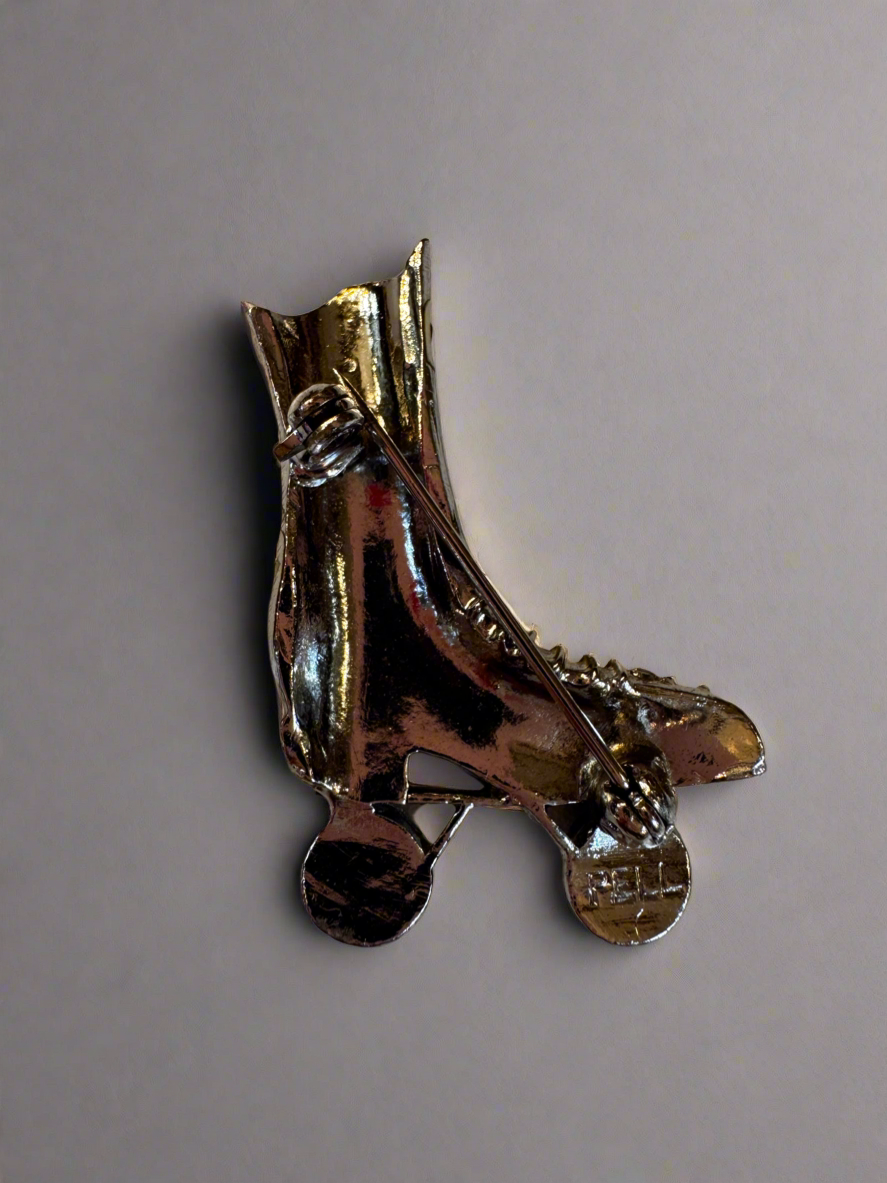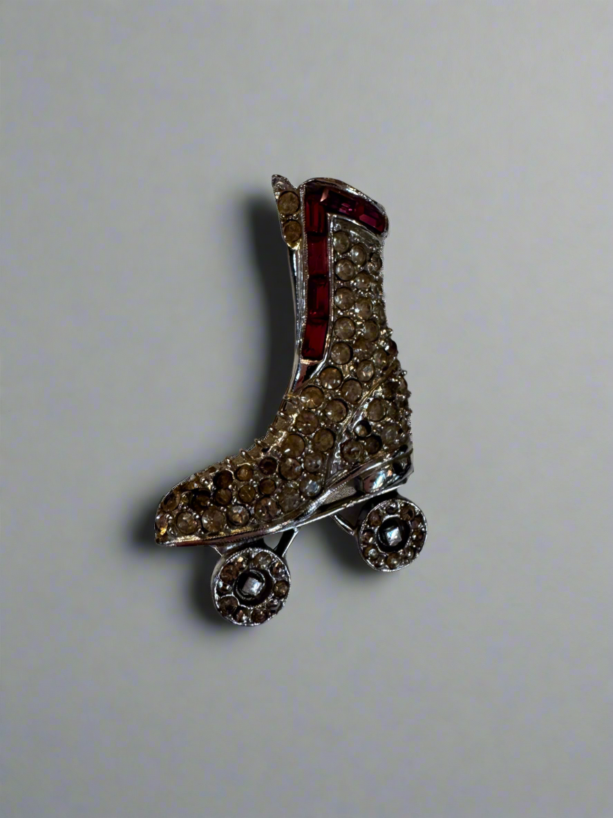 This vintage Pell signed silver-tone rhinestone roller skate brooch, a charming piece of mid-20th century costume jewelry 1.75” tall