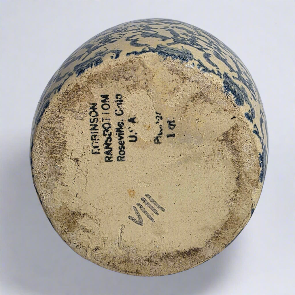 This pitcher features a classic blue and white sponge-painted glaze, giving it a rustic farmhouse aesthetic. The petite size makes it perfect for serving cream, syrup, or gravy, as well as displaying fresh flowers or simply accenting a vintage kitchen. The bottom is clearly marked “Robinson Ransbottom, Roseville, Ohio, USA”, ensuring its authenticity.