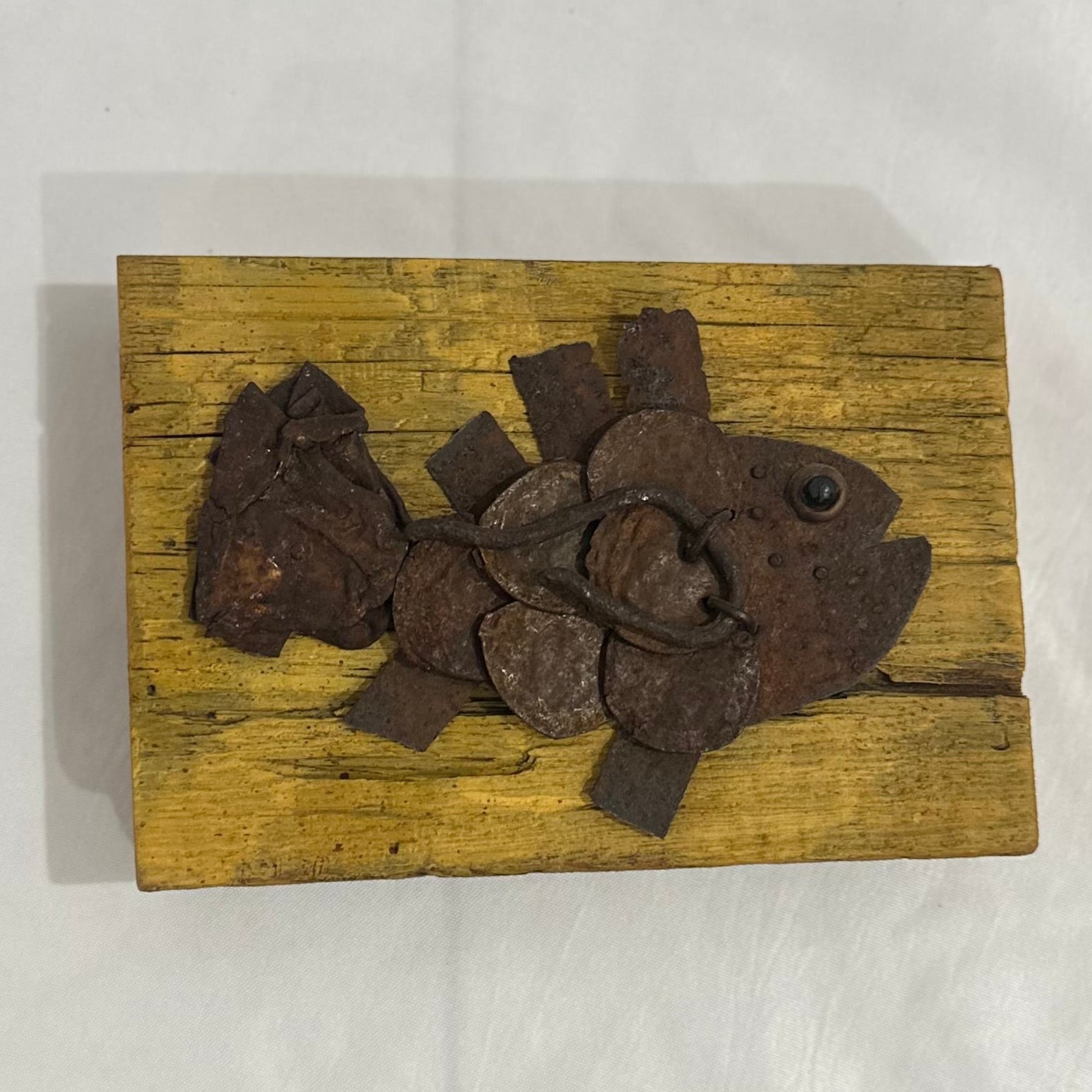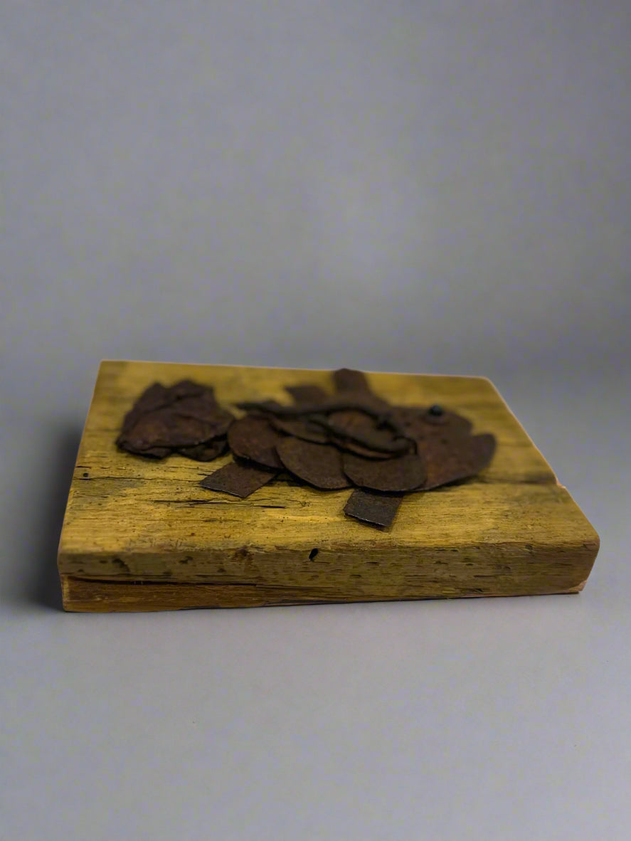 A signed original piece of salvage art made by Louisiana Craft Guild member Trish Ransom. 4.5 inches tall, 6.6inches wide.