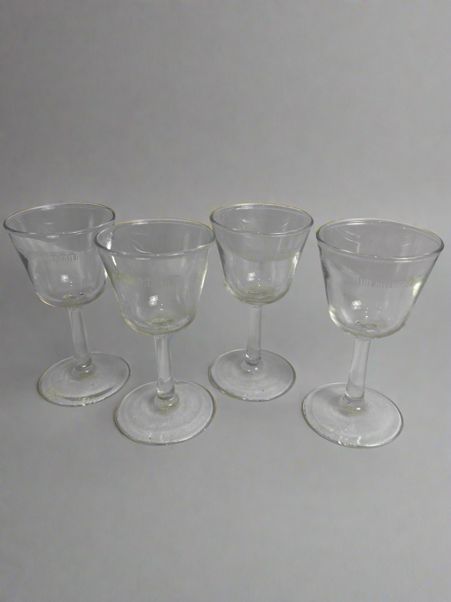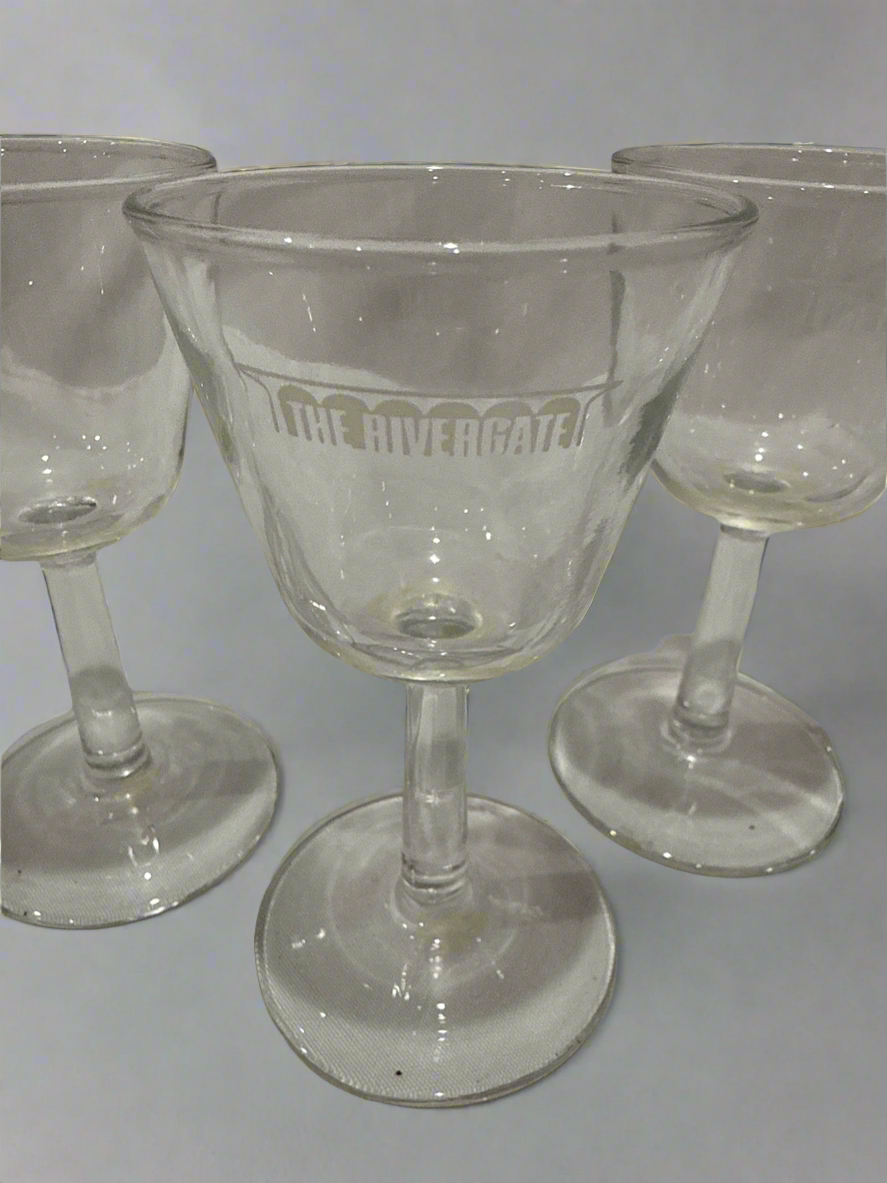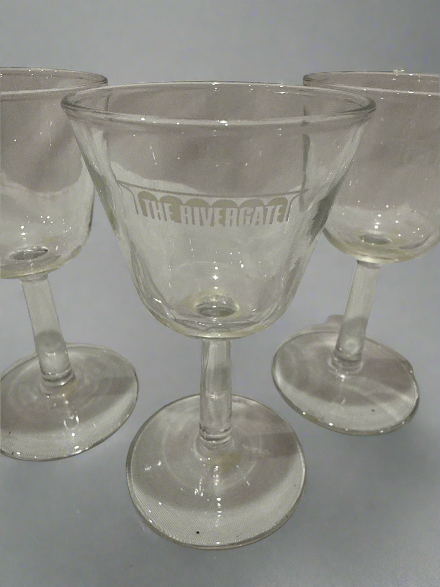 Set of four vintage stemmed cordial/liqueur glasses, each etched with RIVERGATE across the bowl. Produced as promotional barware for the Rivergate Convention Center in New Orleans, which operated from 1968 until its demolition in 1995. Clear pressed glass construction with short stems and flared bowls, each holding approx. 2–3 oz. A piece of New Orleans mid-20th century history and memorabilia.