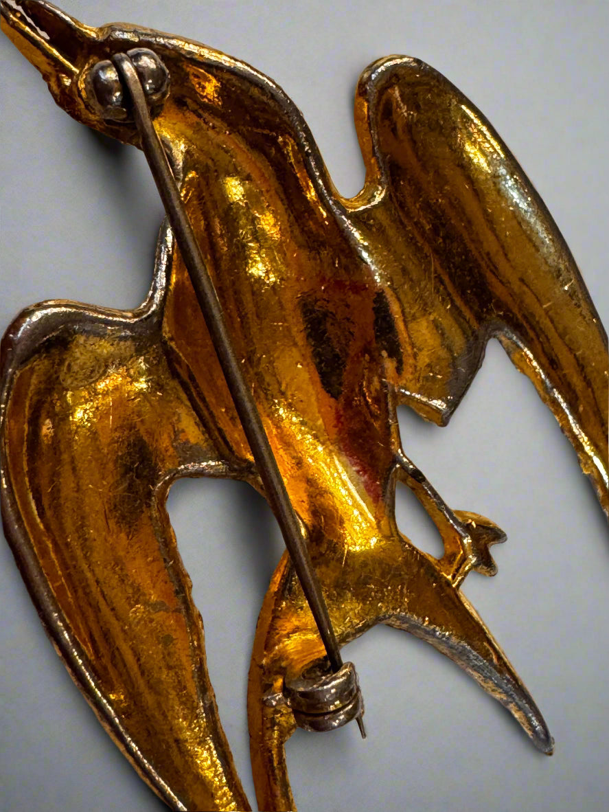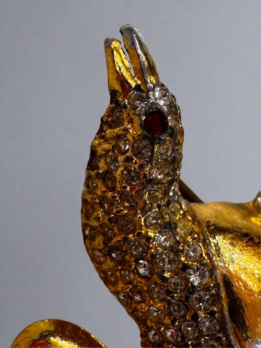 A charming vintage gold-tone swallow brooch, adorned with sparkling rhinestones and a red eye, serves as a timeless symbol of hope and safe journeys.