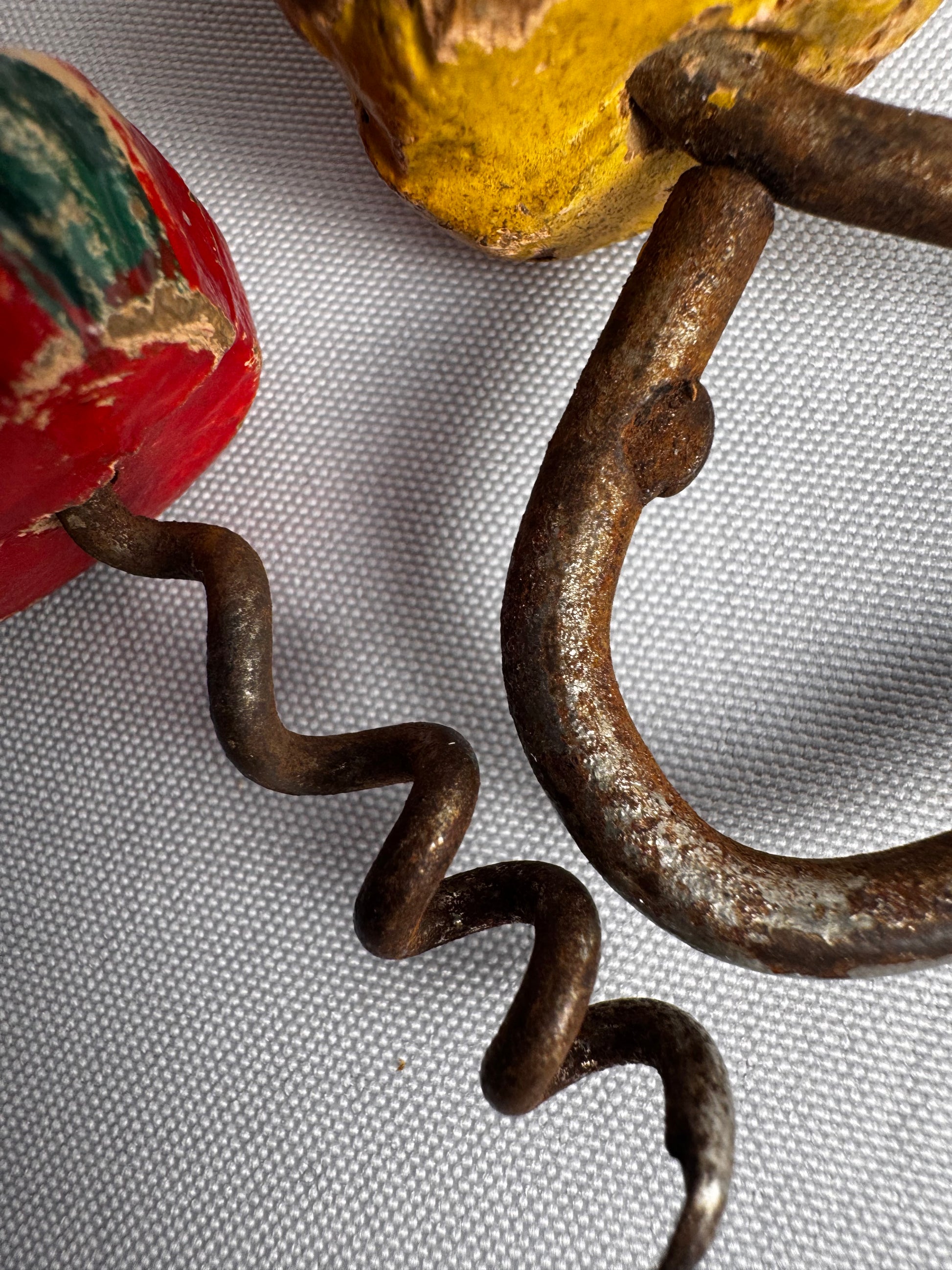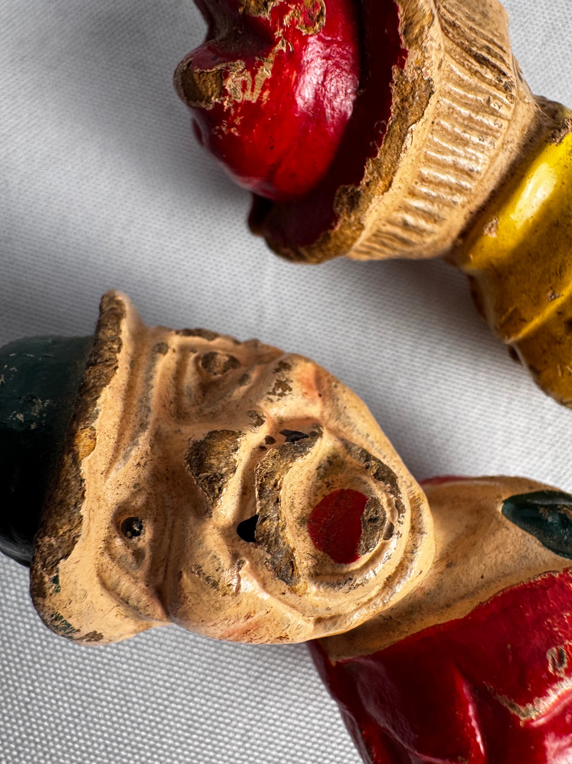 Authentic Mid-Century (1940s-1950s) novelty set featuring hand-painted carved wooden figures of Stan Laurel (corkscrew) and Oliver Hardy (bottle opener).
