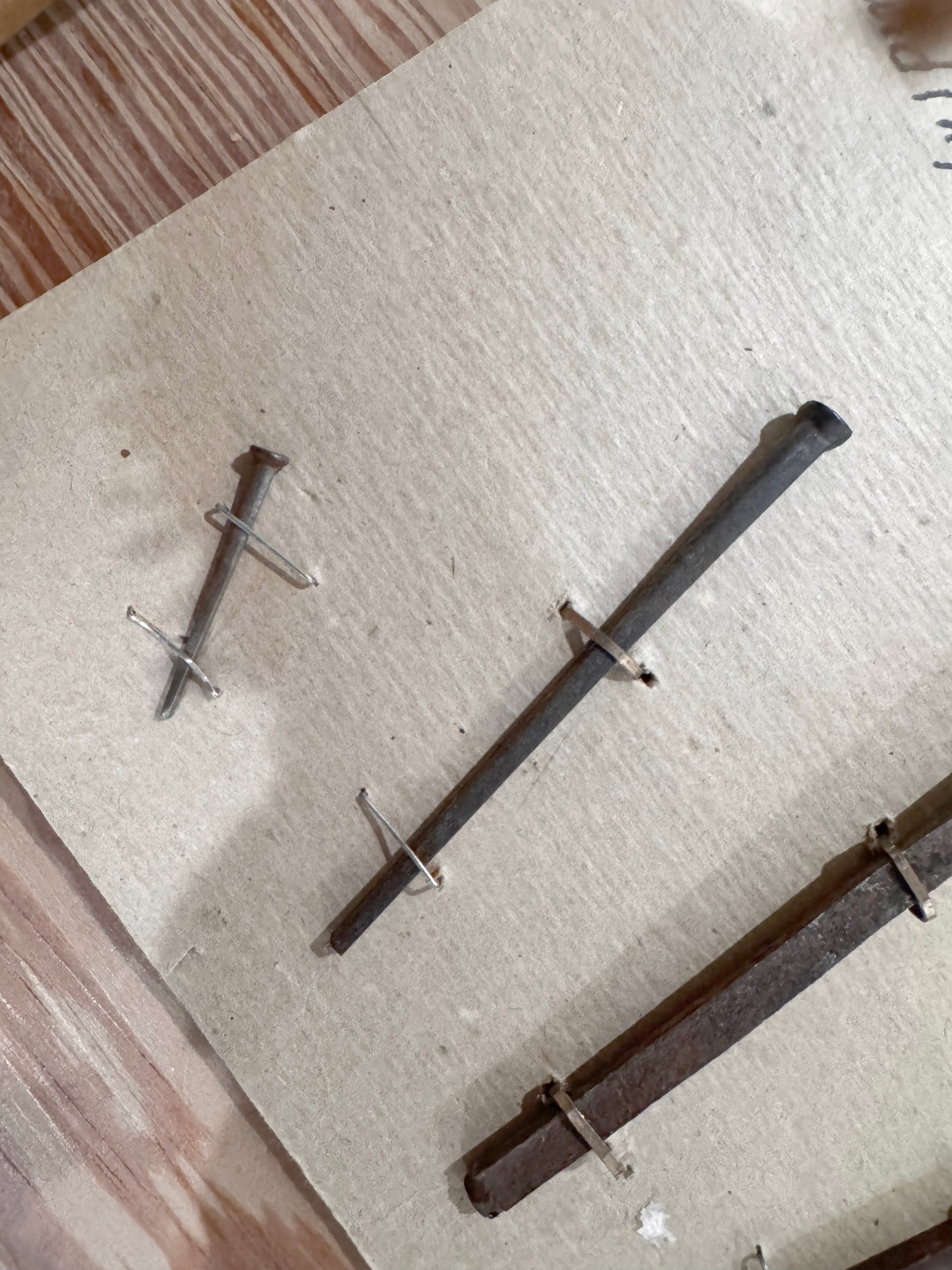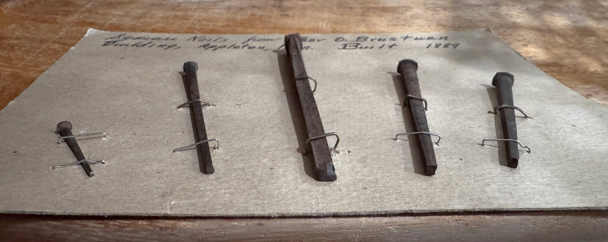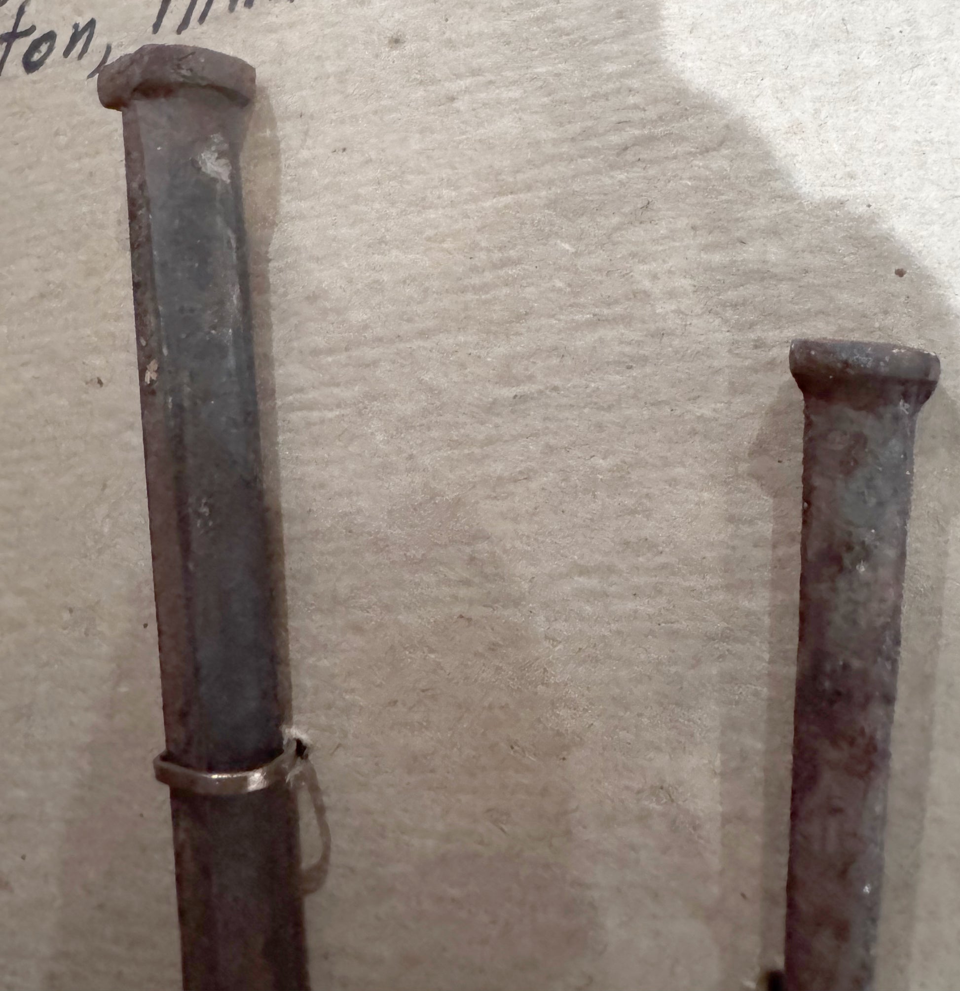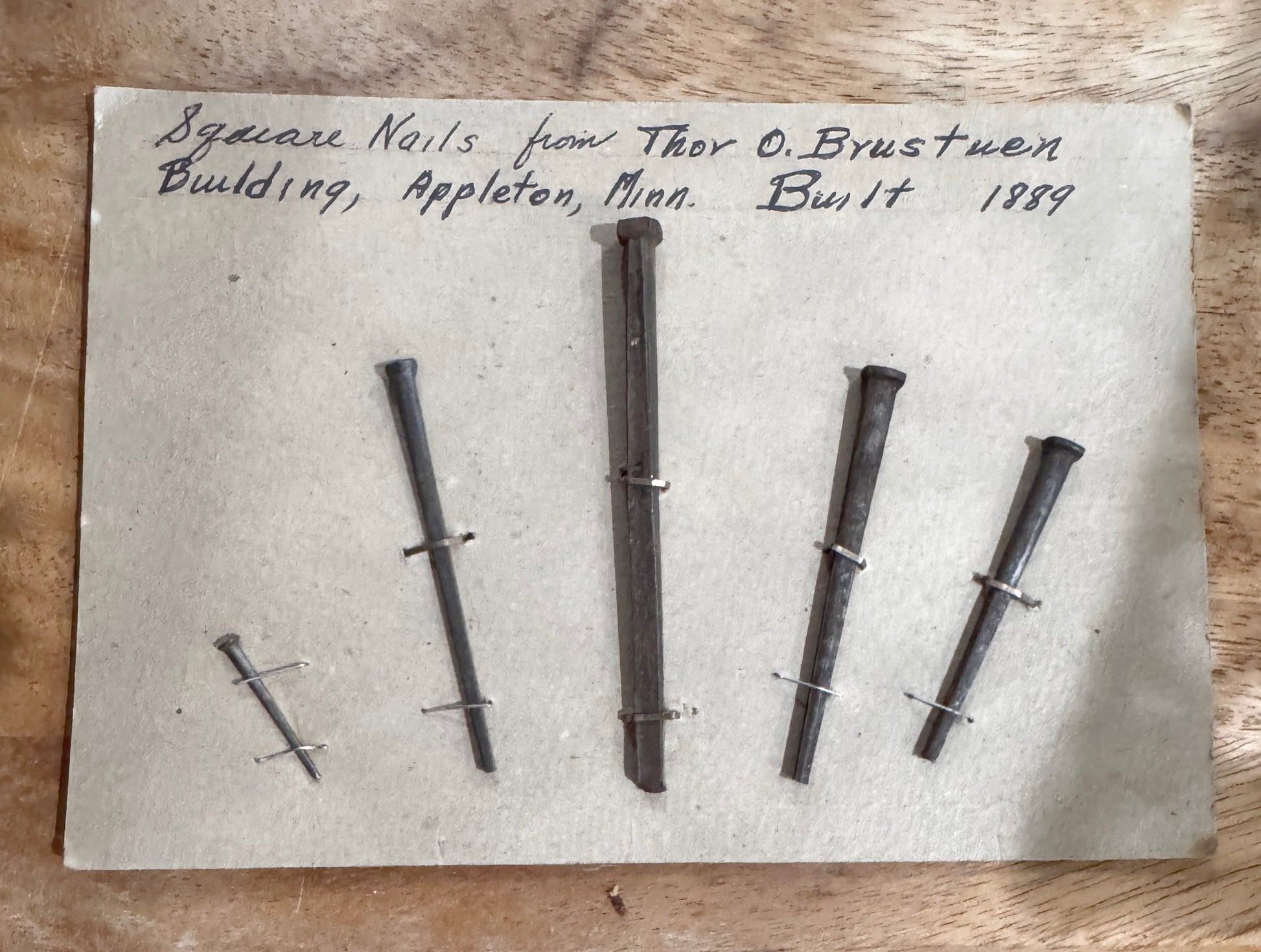 Square head nails from the Thor O. Brustuen Building, Appleton, Minnesota (built 1889). Mounted on a cardboard backer.