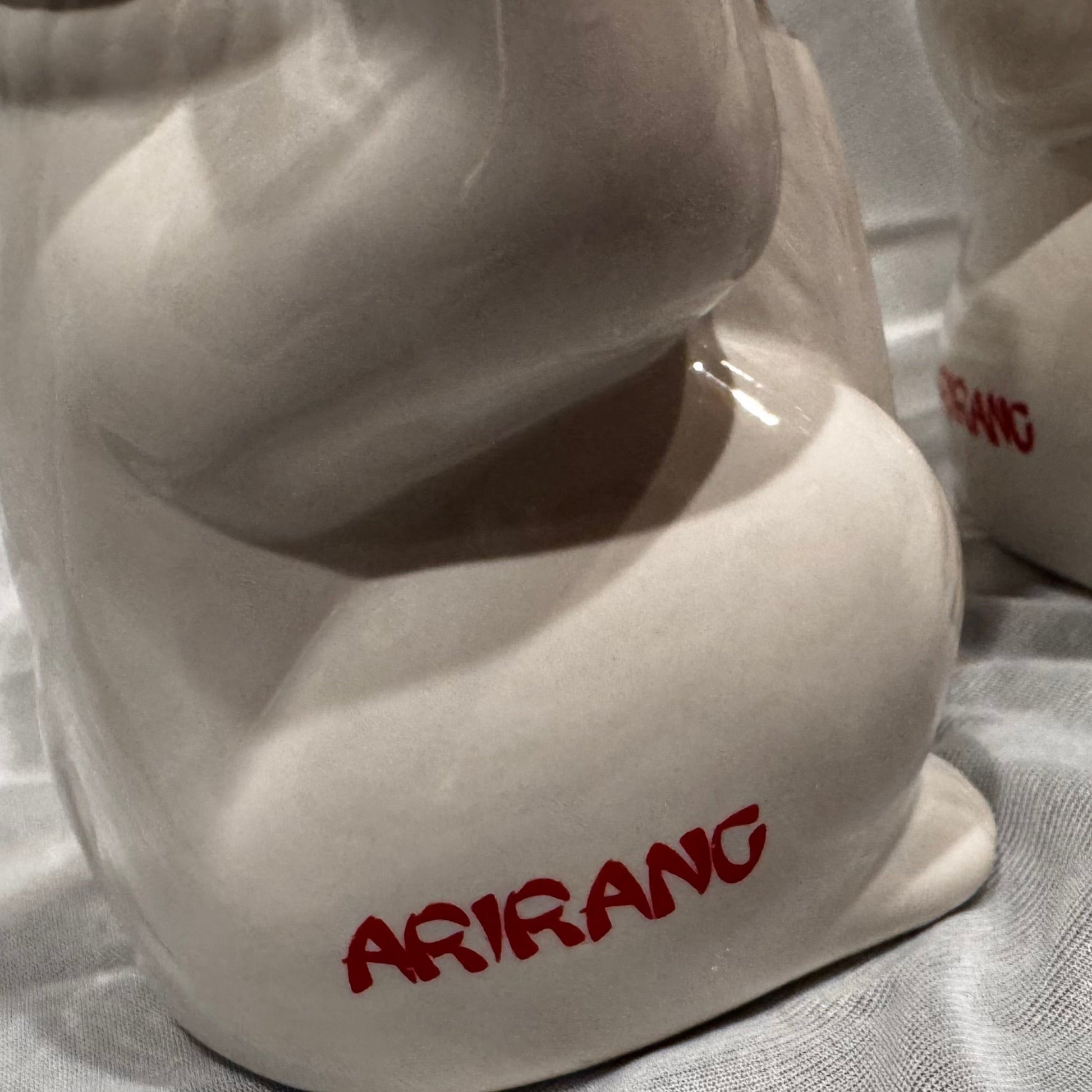 Collectible pair of glossy white ceramic Maneki Neko (Lucky Cat) cups from the Arirang restaurant. These figural mugs feature the classic beckoning cat design, often used for cocktails or other drinks. Stamped "ARIRANG" on the back and marked "MADE IN CHINA DWP" on the base. Excellent unique Asian restaurant memorabilia or addition to a tiki mug/cat collection. Great condition.