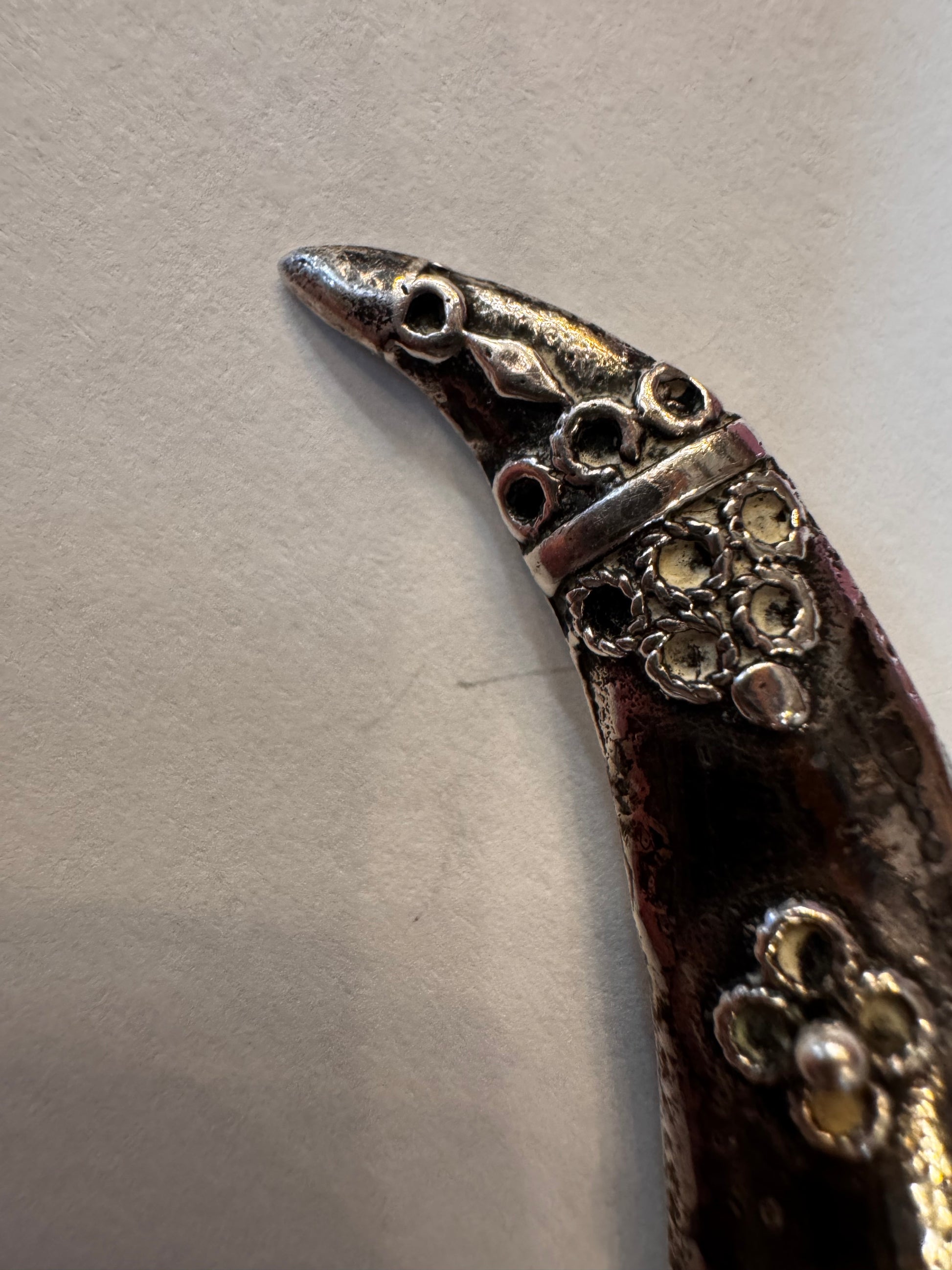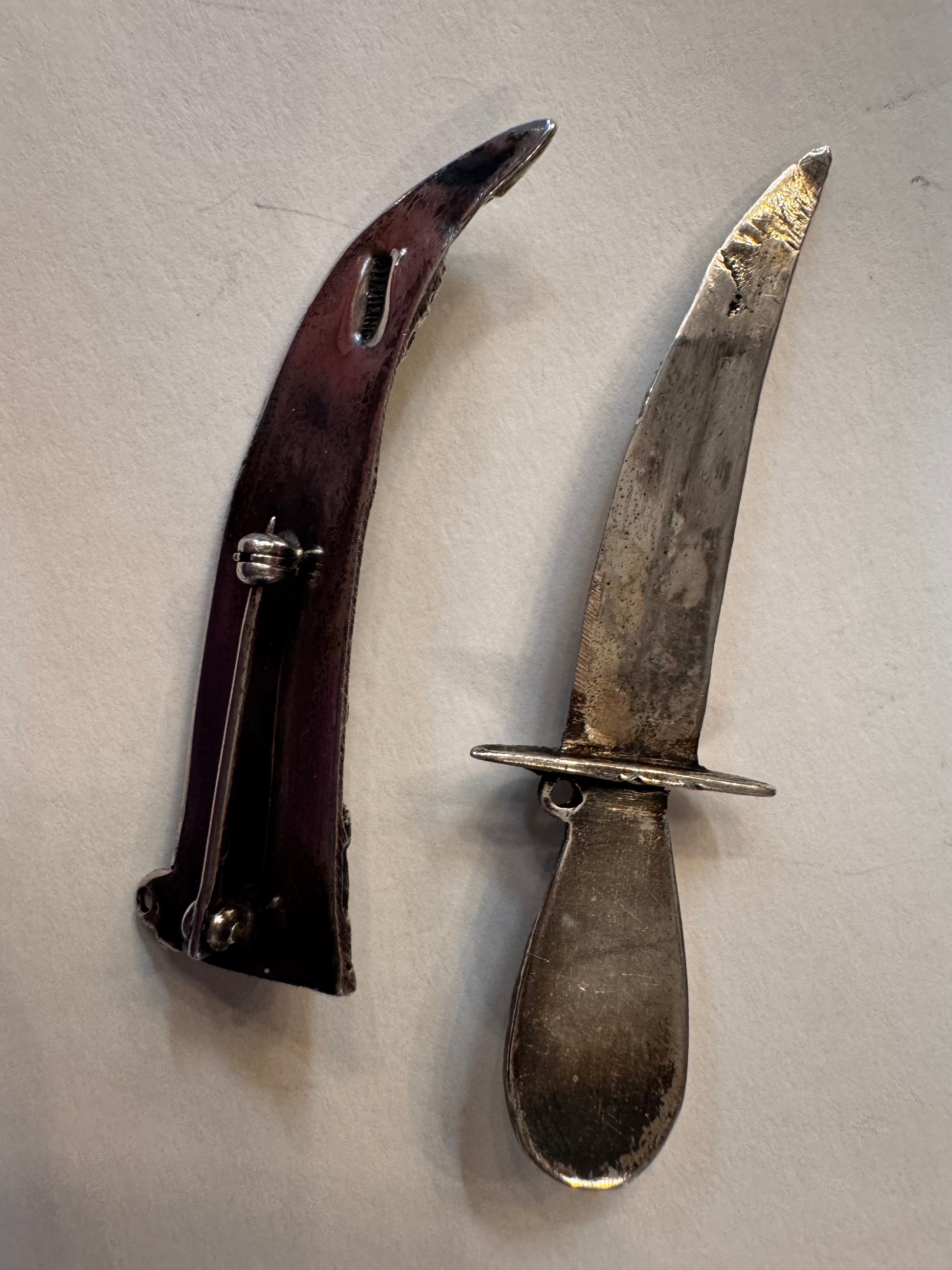 This authentic vintage sterling silver dagger brooch features an ornate floral filigree design and a two-piece construction with a removable dagger and sheath