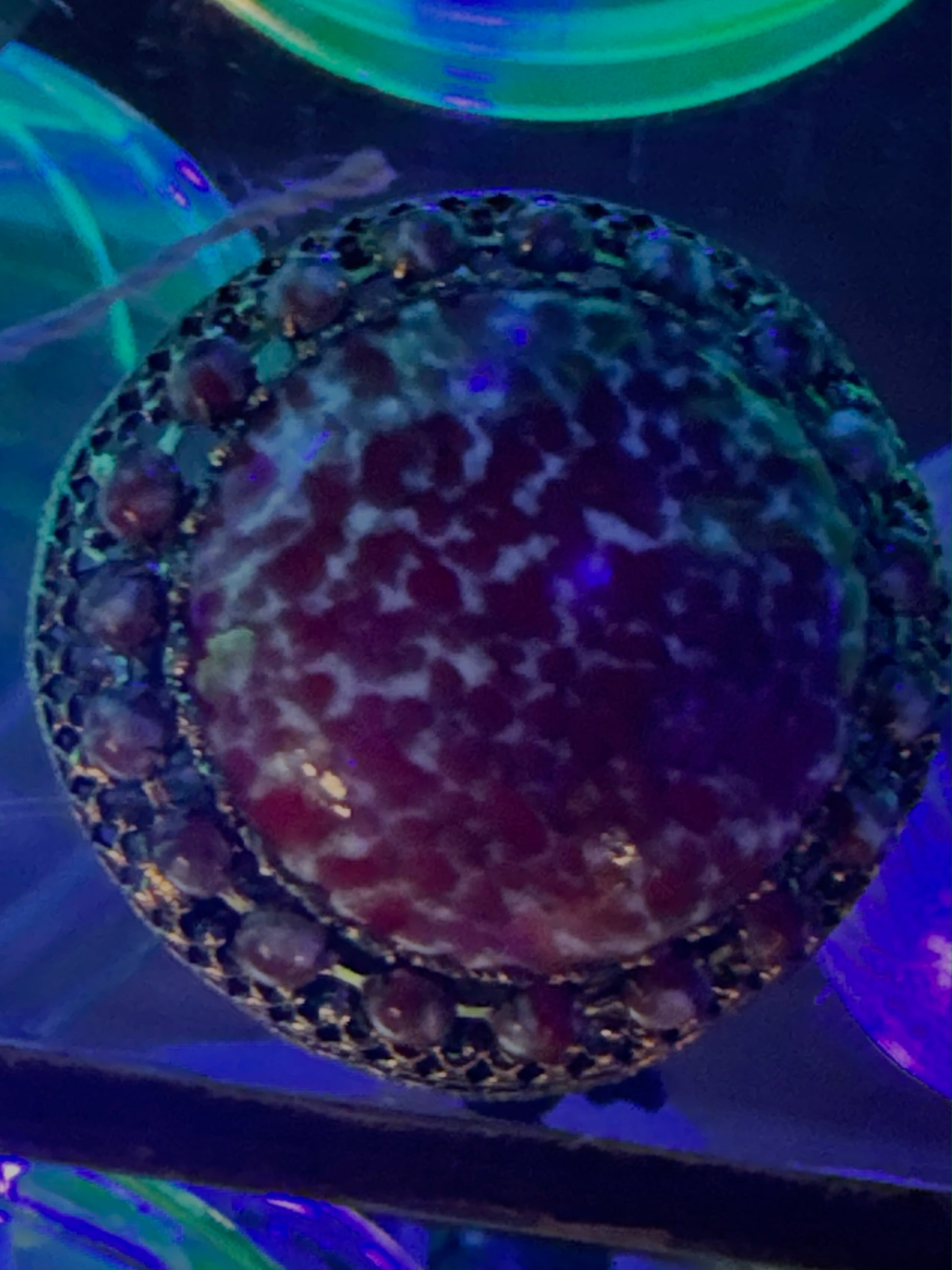 This is a vintage, round brooch, 1.5 inches in diameter. It features a central, domed red and white speckled art glass cabochon set in an intricate gold-tone filigree frame. The glass fluoresces under UV light, a feature highly sought after by collectors. The back has a standard pin-back closure. This piece is ideal for collectors of unique vintage jewelry and UV-reactive glass.