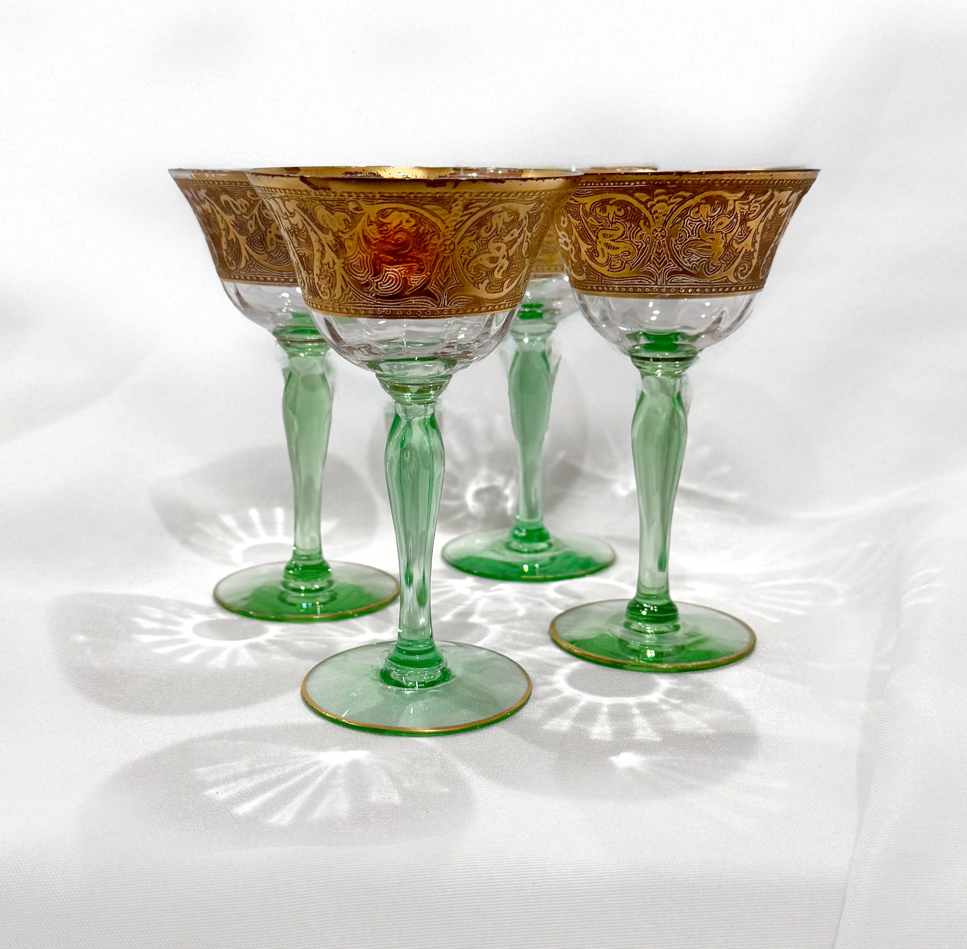 Uranium glass green and etched gold cordial glasses. Set of 4, glows in blacklight. Chips in gold on a couple of them on the top.