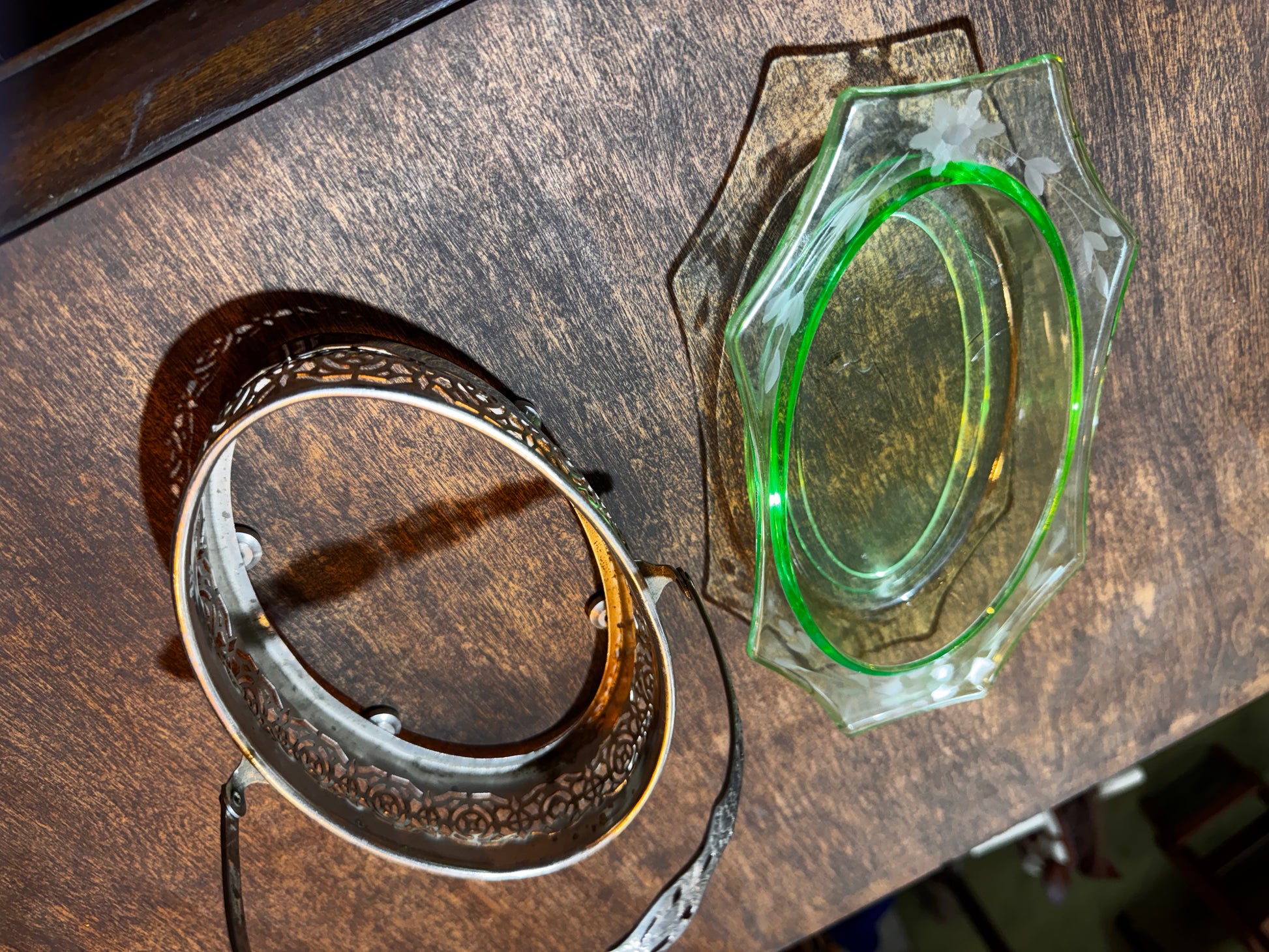 Antique green uranium glass dish with ornate silver-plated stand and decorative handle. Features etched floral designs on the glass. Fluoresces bright green under UV light, confirming its uranium content. A captivating vintage collectible.