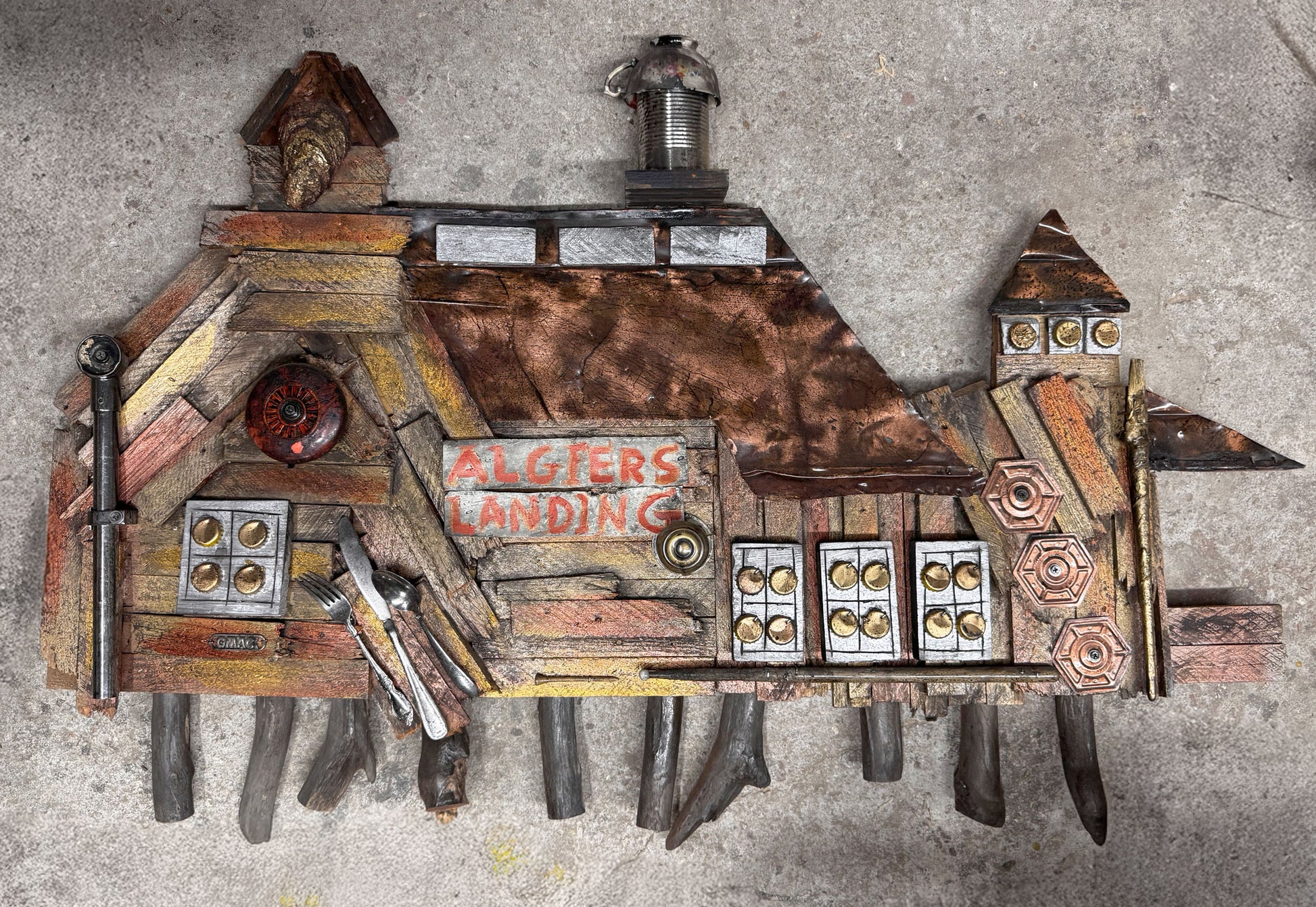 Known for his extraordinary ability to transform discarded materials into soulful works of art, Lance "Varg" Vargas masterfully constructs this scene using salvaged wood and found objects, elements that once breathed life into New Orleans' vibrant past. The texture and character of these reclaimed materials create a stunning three-dimensional effect, drawing you into the storied landscape of Algiers Point.
