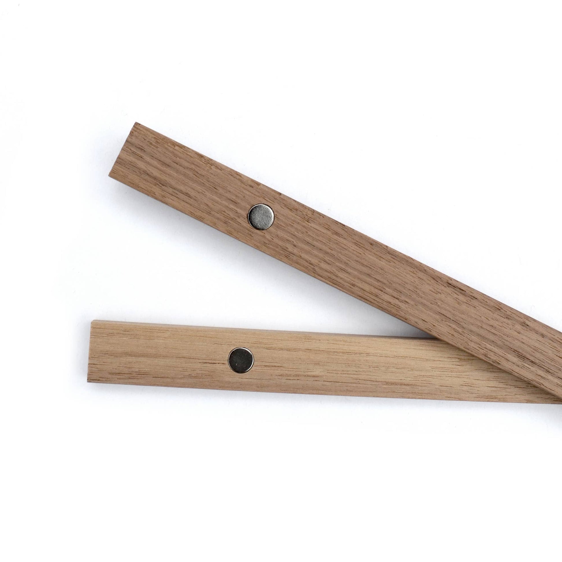 The frame set includes 4 sticks, 2 clamping the top of paper and two clamping the bottom. Neodymium magnets are embedded, keeping the art damage free and allowing you to change out the art at any time! Our magnets are strong enough to hold the print in the packaging with mat backing so they stay protected while displayed in your shop. The frame set comes with suede hanger attached.
