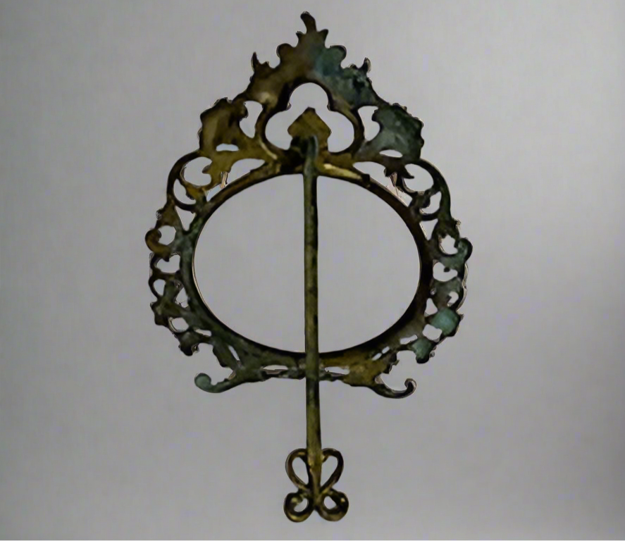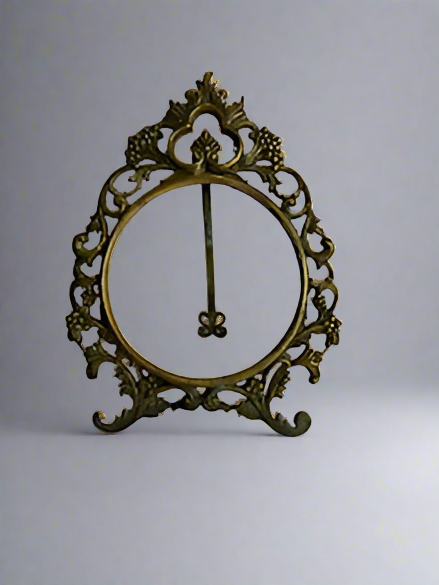Vintage brass ornate open face frame with easel back. Height - 11 1/2 inches; Width - 9 1/2 inches; Face diameter - 6 inches.