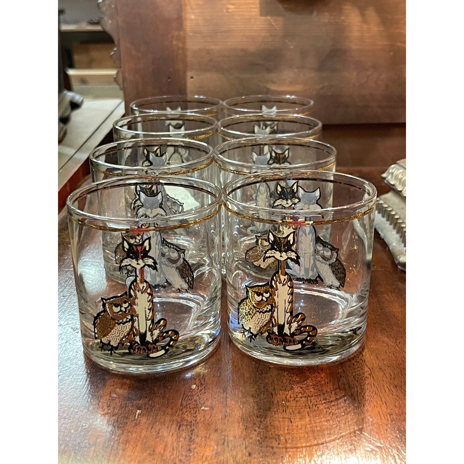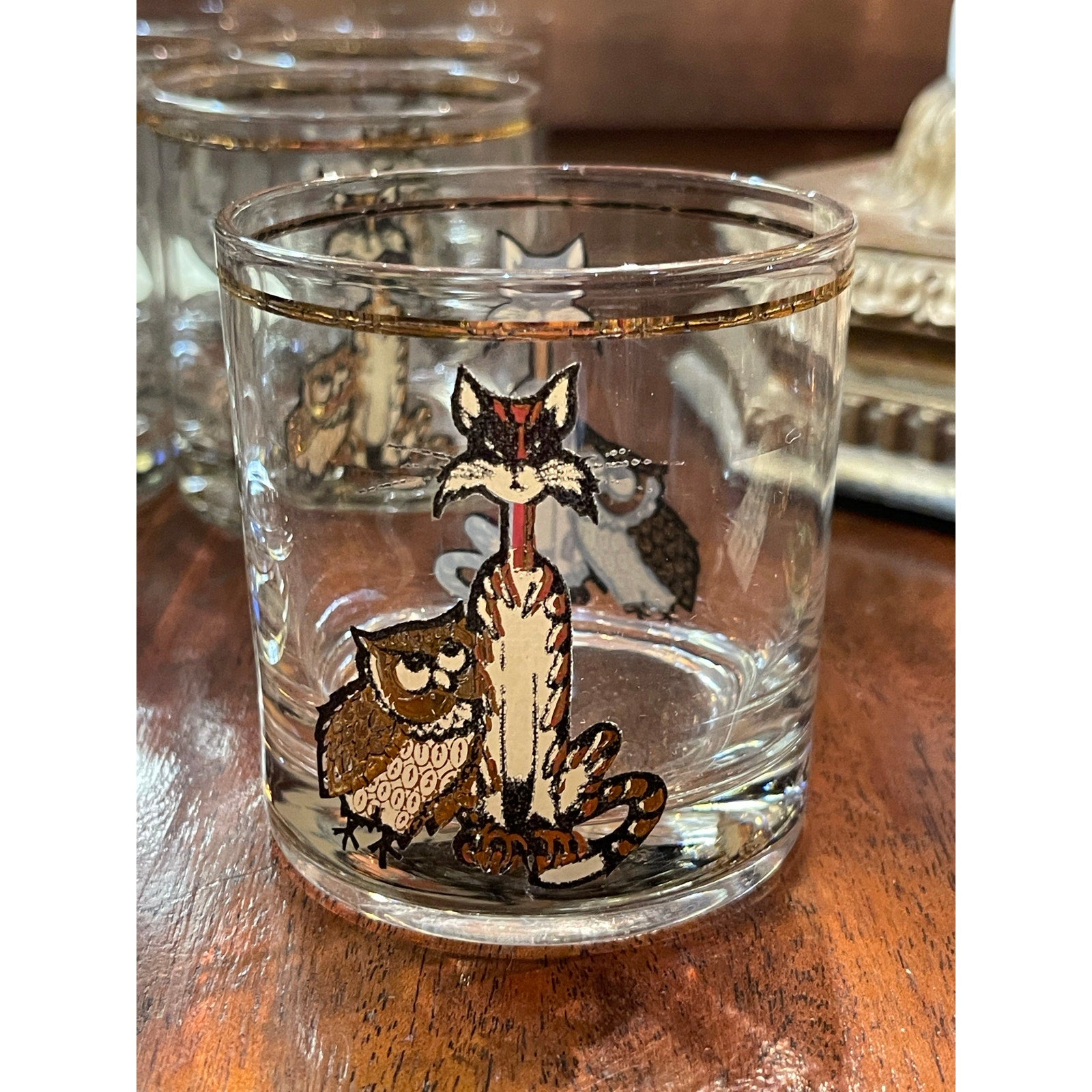 Vintage Culver 22K MCM Mid-Century Modern cat and owl low ball glass set of 8