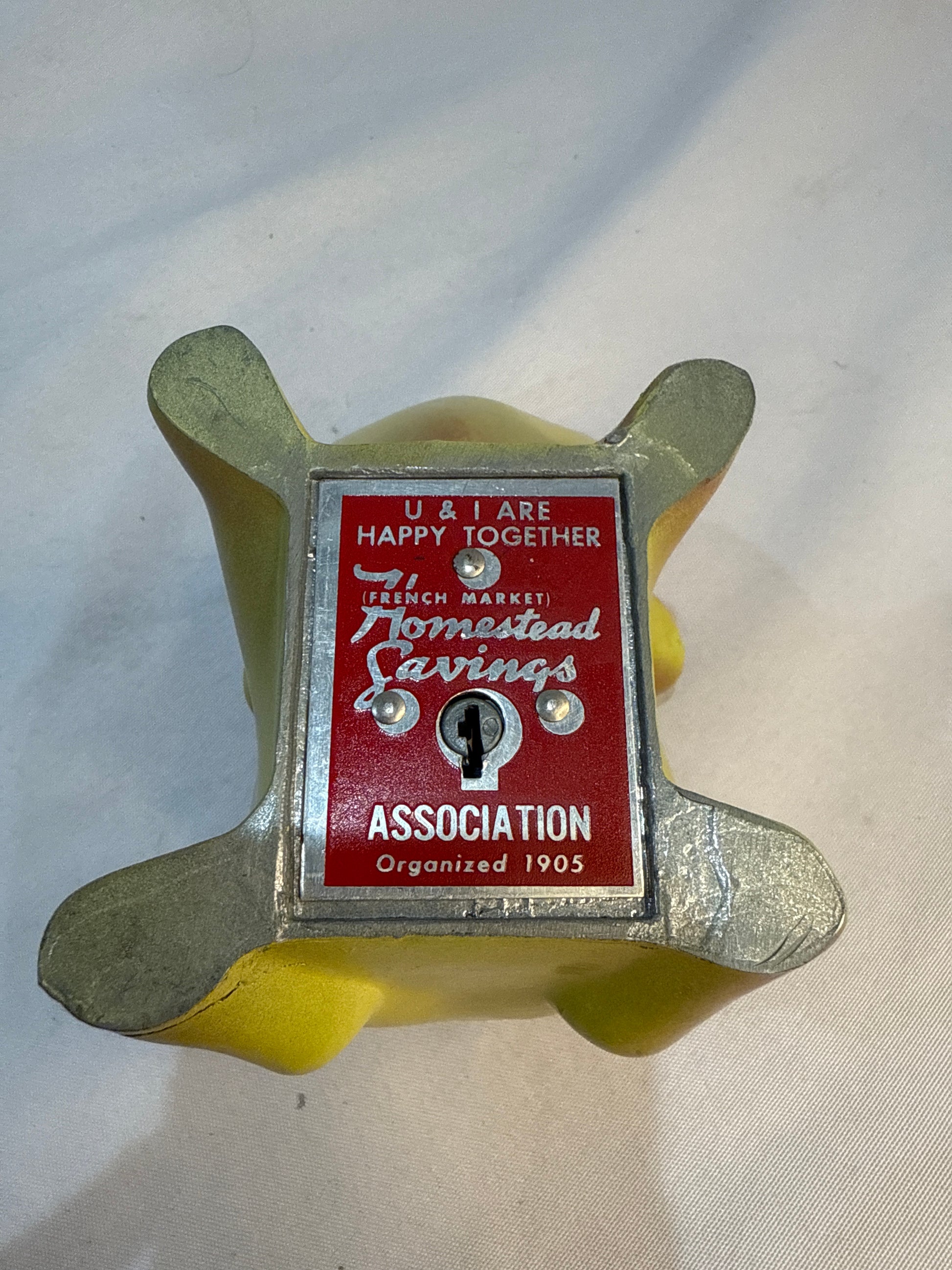 Brighten your shelves (and your savings) with this charming vintage piggy bank from Homestead Savings Association, a New Orleans institution founded in 1905. This midcentury promotional giveaway features a cheerful yellow pig with hand-painted details and a secure metal coin trap marked “U & I Are Happy Together.” A nostalgic throwback to neighborhood banking and the golden age of advertising.