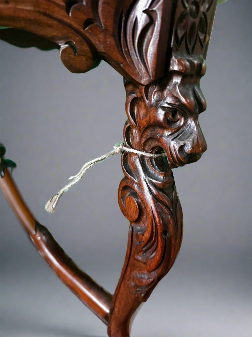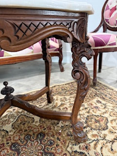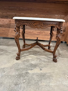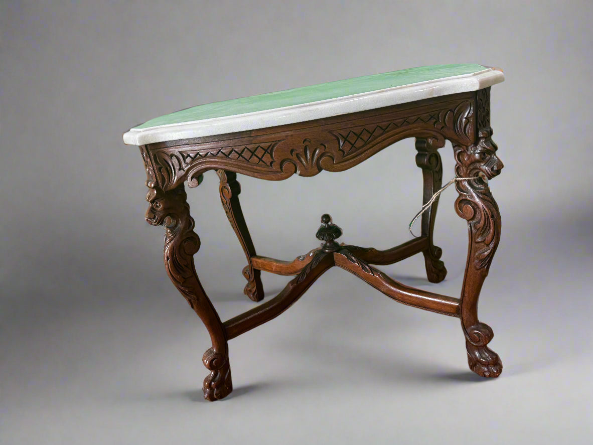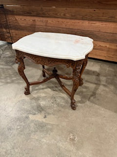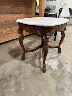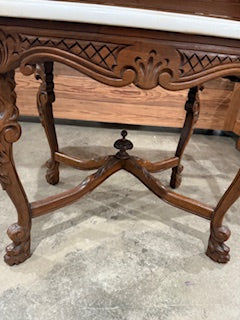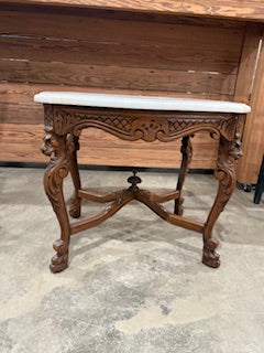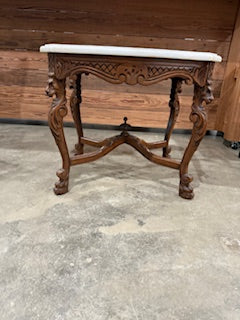 Vintage marble top table with carved lion legs. Height - 21 1/2 inches; Width 25 inches; Depth 19 1/4 inches.