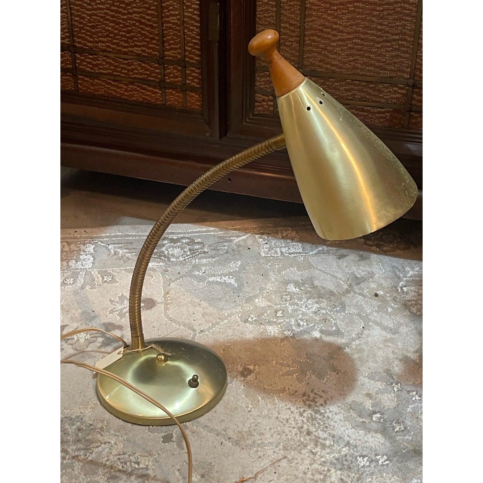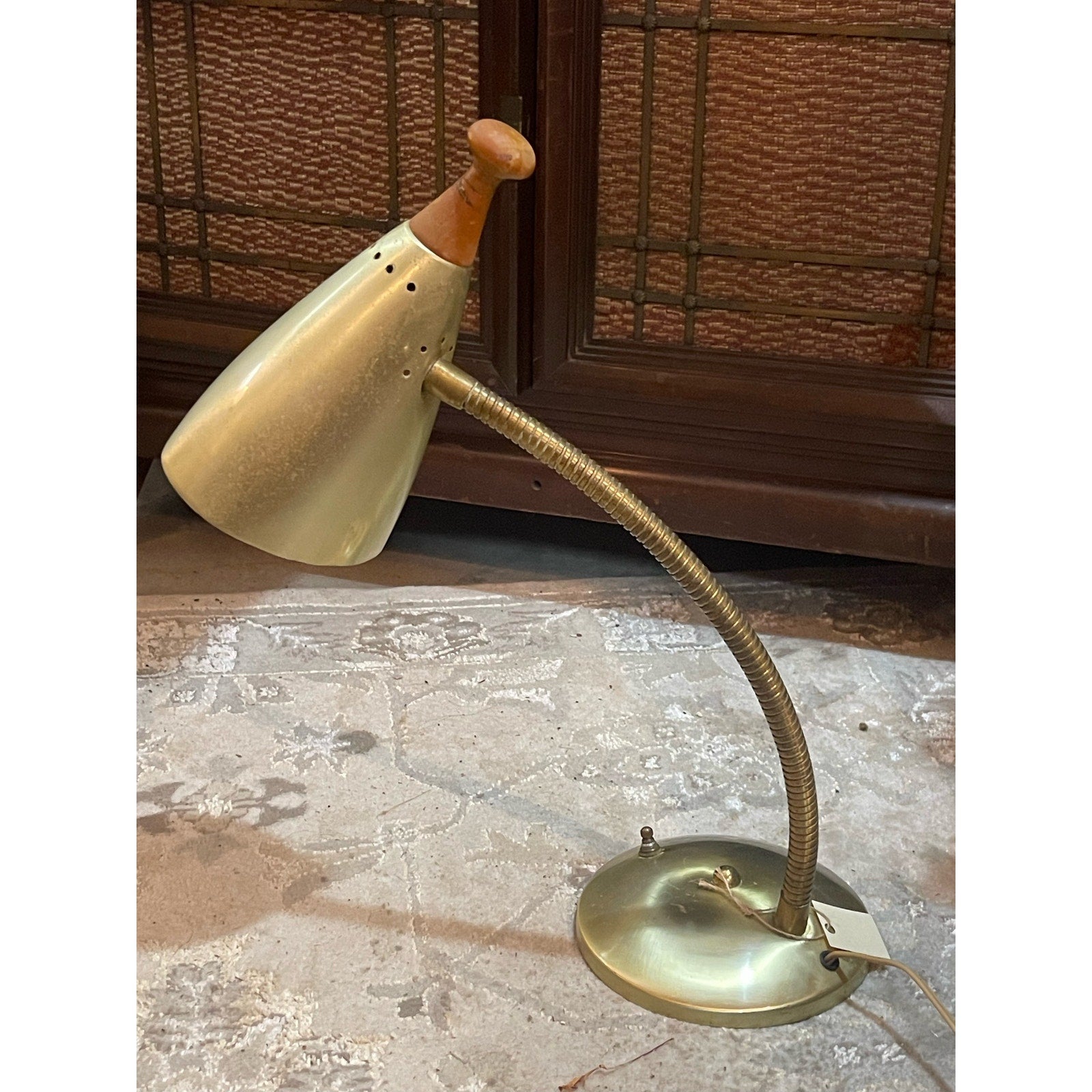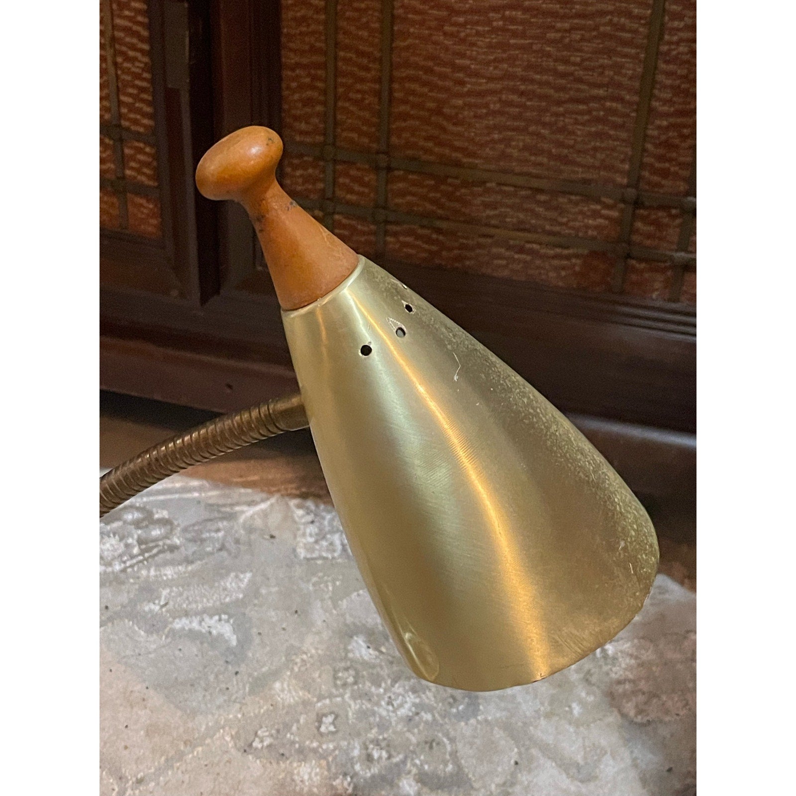 Vintage MCM brass wood gooseneck plug in desk lamp light WORKS