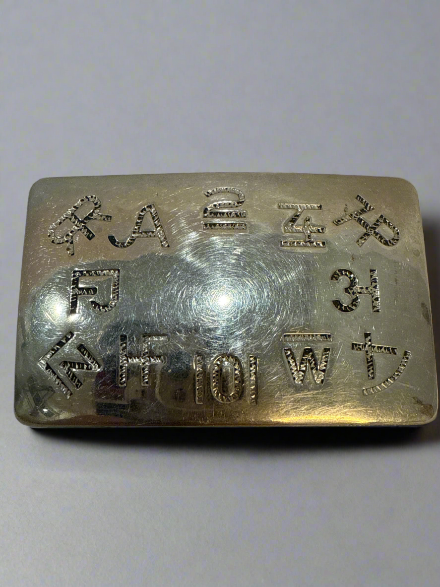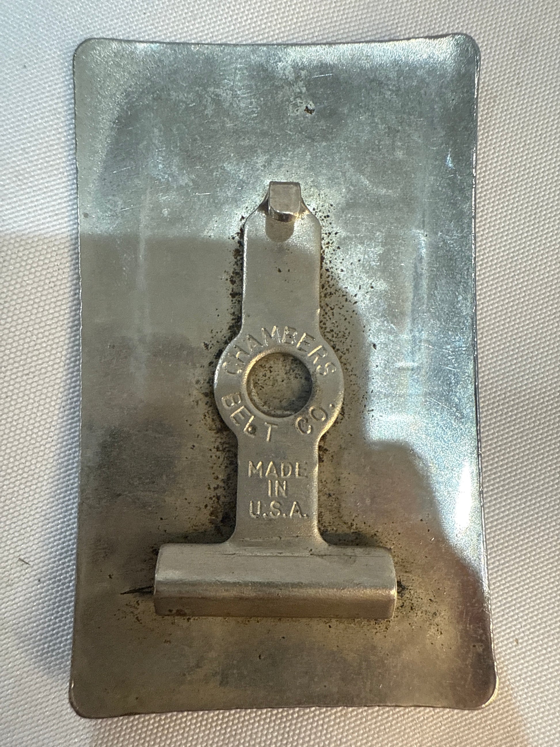 Tap into retro mystique with this bold and unusual vintage belt buckle by Chambers Belt Co. Featuring a face of raised cryptic symbols—resembling an alien language or encoded text—this piece captures the spirit of 1970s–80s novelty design. Whether you’re into sci-fi, fantasy, or just love a conversation starter, this buckle brings the strange in style.