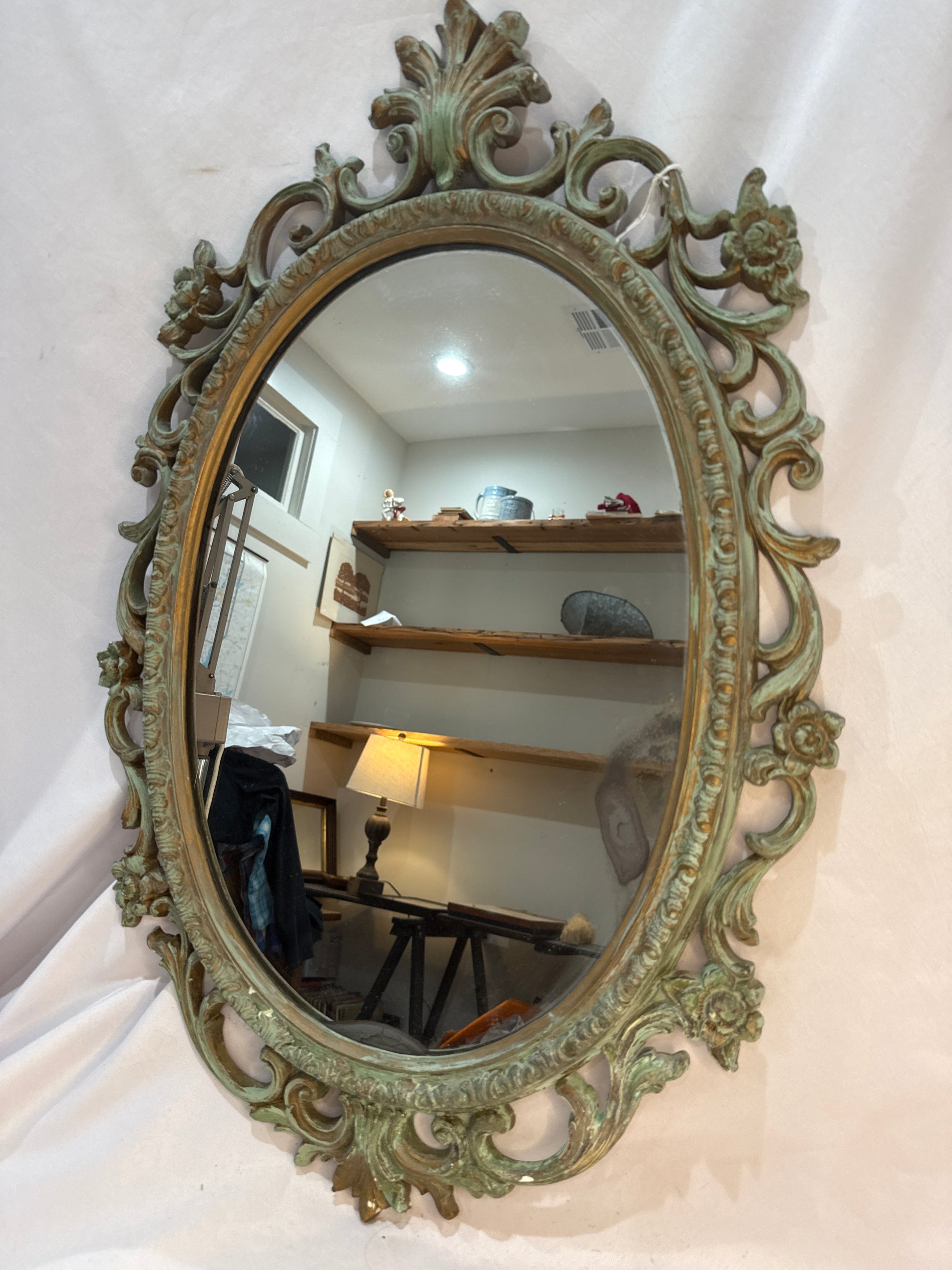 Add timeless elegance to any room with this vintage cast metal wall mirror, featuring an intricate rococo-style frame with floral and scroll details. Finished in an aged verdigris patina, this oval mirror evokes the romance of antique French design with the durability of mid-century craftsmanship. Ideal for entryways, vanities, or vintage-inspired interiors.