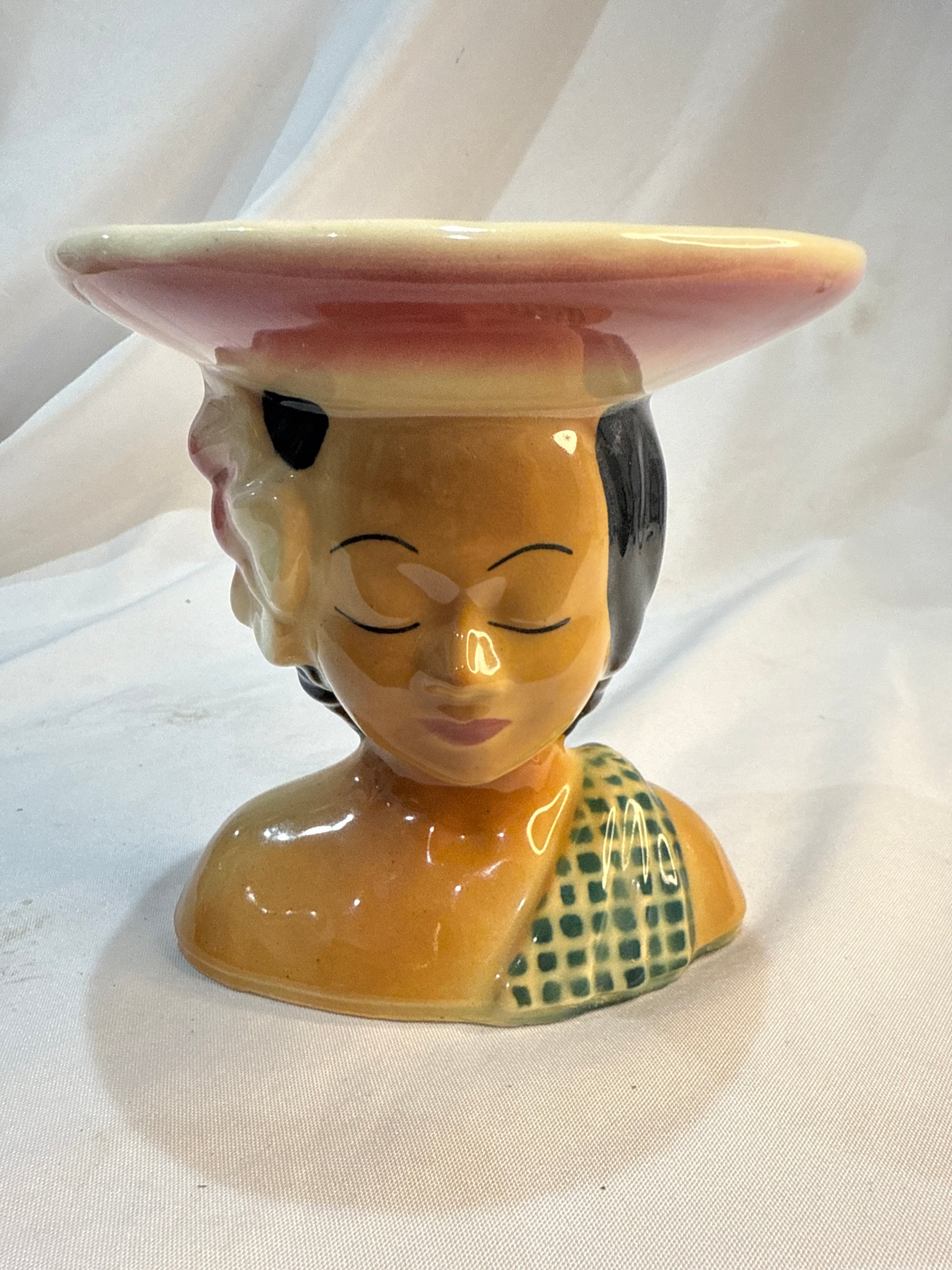 Add retro charm to your collection with this whimsical Shawnee Pottery figural head vase. Featuring a serene woman’s face and a wide-brimmed hat that doubles as a shallow dish, this 1940s–1950s piece is finished in warm pastel glazes and fine detailing. Marked “Shawnee USA 876” on the base, it’s perfect as a candy dish, vanity tray, or simply as an eye-catching shelf piece.