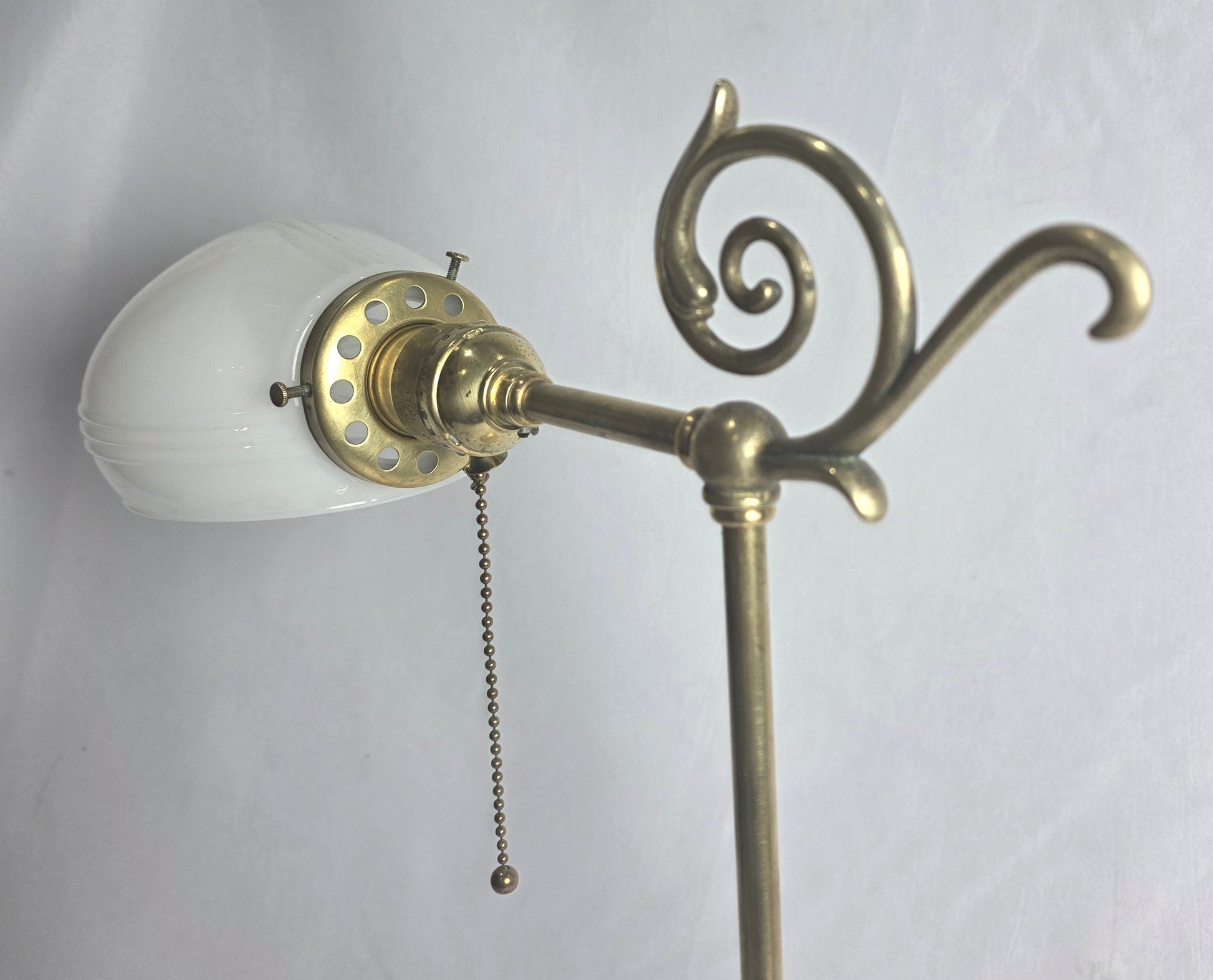 Crafted in warm brass, the lamp features a graceful gooseneck design that allows the shade to be positioned for directed light, making it ideal as a task or reading lamp. The ribbed milk glass shade softly diffuses light while adding classic Art Deco texture and visual interest. A traditional pull-chain switch completes the design, a hallmark feature of mid-20th-century lamps and later Art Deco revival pieces.