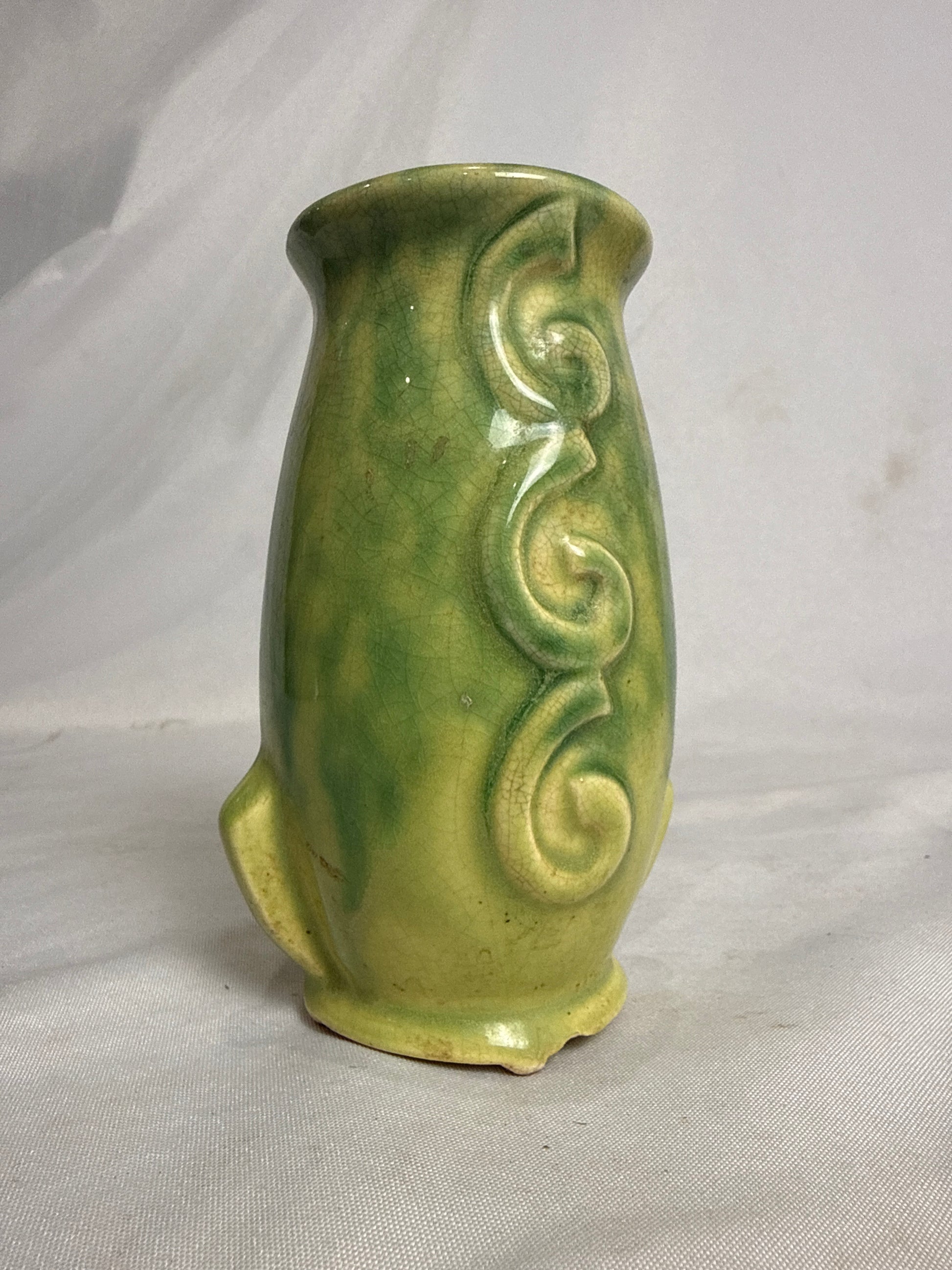 This unmarked vintage art pottery bud vase is made of glazed ceramic in an olive green color with a mottled finish. It features a bulbous body tapering to a narrow neck and a flared base. The design includes raised spiral scroll motifs vertically along the body in an Art Nouveau style. It measures approximately 4 inches tall and is suitable for holding single flower stems or as a decorative accent.