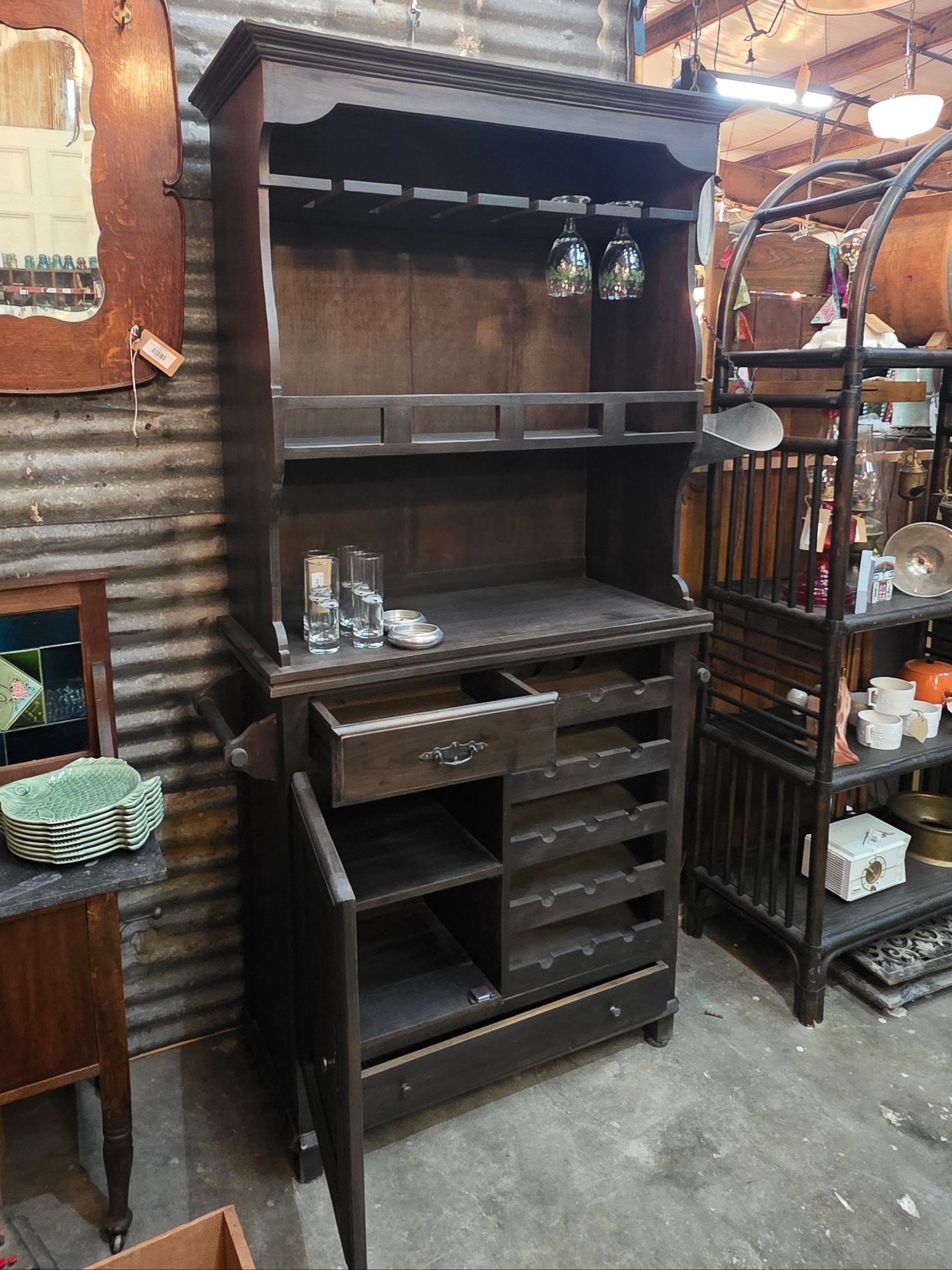 Elevate your entertaining space with this handsome vintage wooden liquor cabinet, a beautifully crafted multifunctional home bar that combines classic style with exceptional storage. Featuring a rich dark wood finish, built-in wine glass holders, spacious shelving, and dedicated bottle racks, this piece brings both charm and functionality to any dining room, kitchen, or bar area.