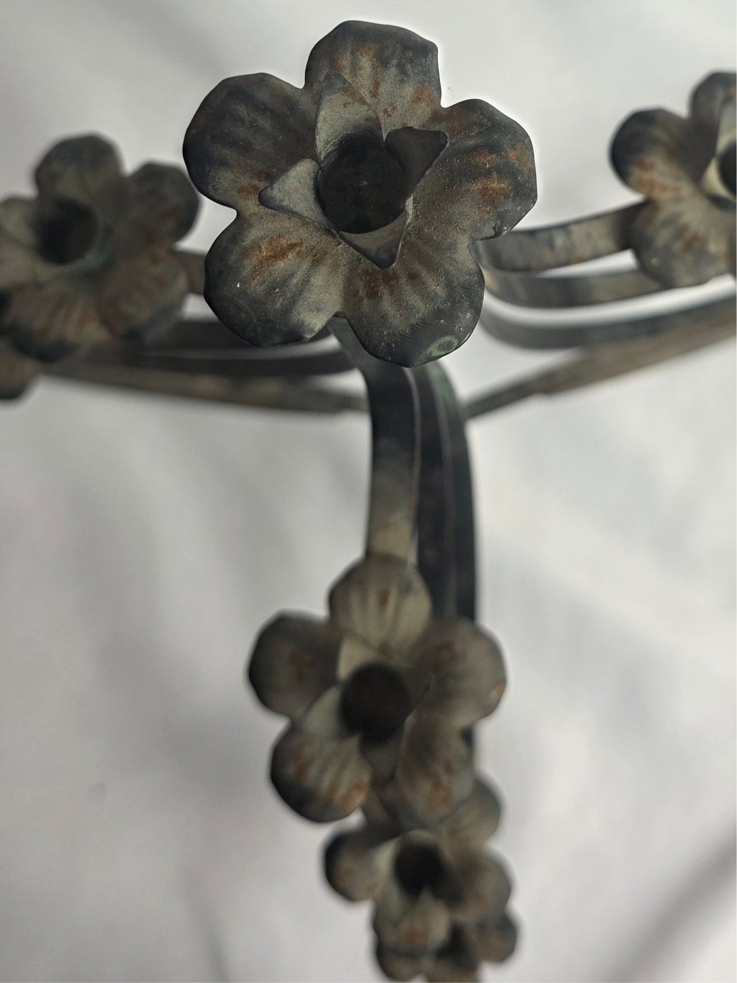 Design: Tree-shaped frame with curved scroll base and nine flower-style candle holders
