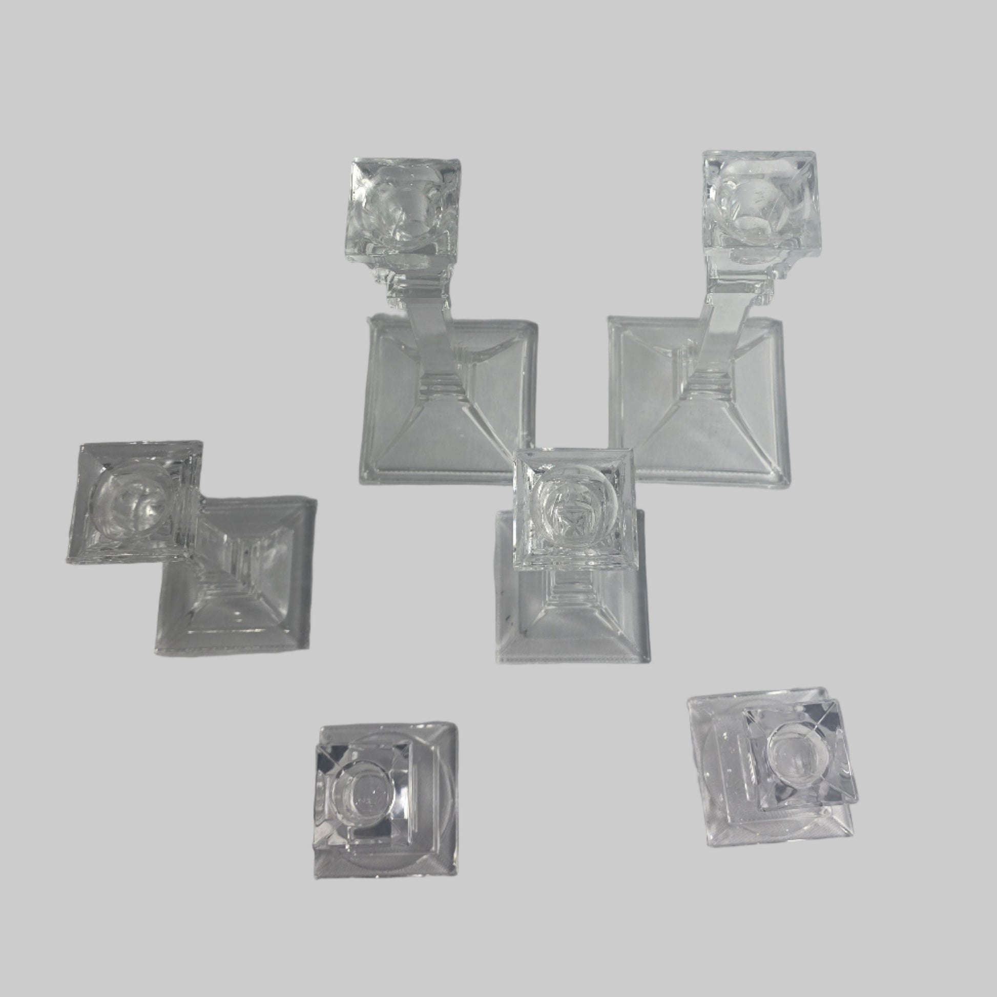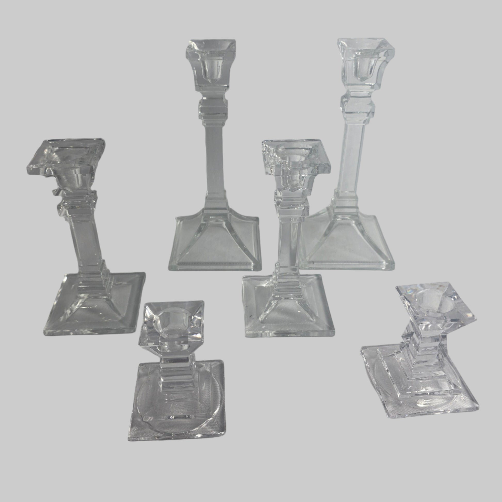 Add timeless elegance to your home with this beautiful set of 6 vintage glass candle holders. Featuring a classic geometric design with square pedestal bases and multi-faceted stems, these clear glass candle holders bring a touch of sophistication to any space. Their varying heights make them perfect for creating a dynamic, layered display on a dining table, mantel, entryway, or centerpiece.