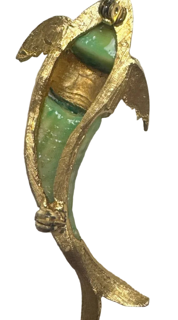 Rare 1960s Hattie Carnegie "Piranha" Demi-Parure – Faux Jade & Gold-Tone Fish Brooch with Matching Shell Earrings – Iconic Kenneth Jay Lane Design