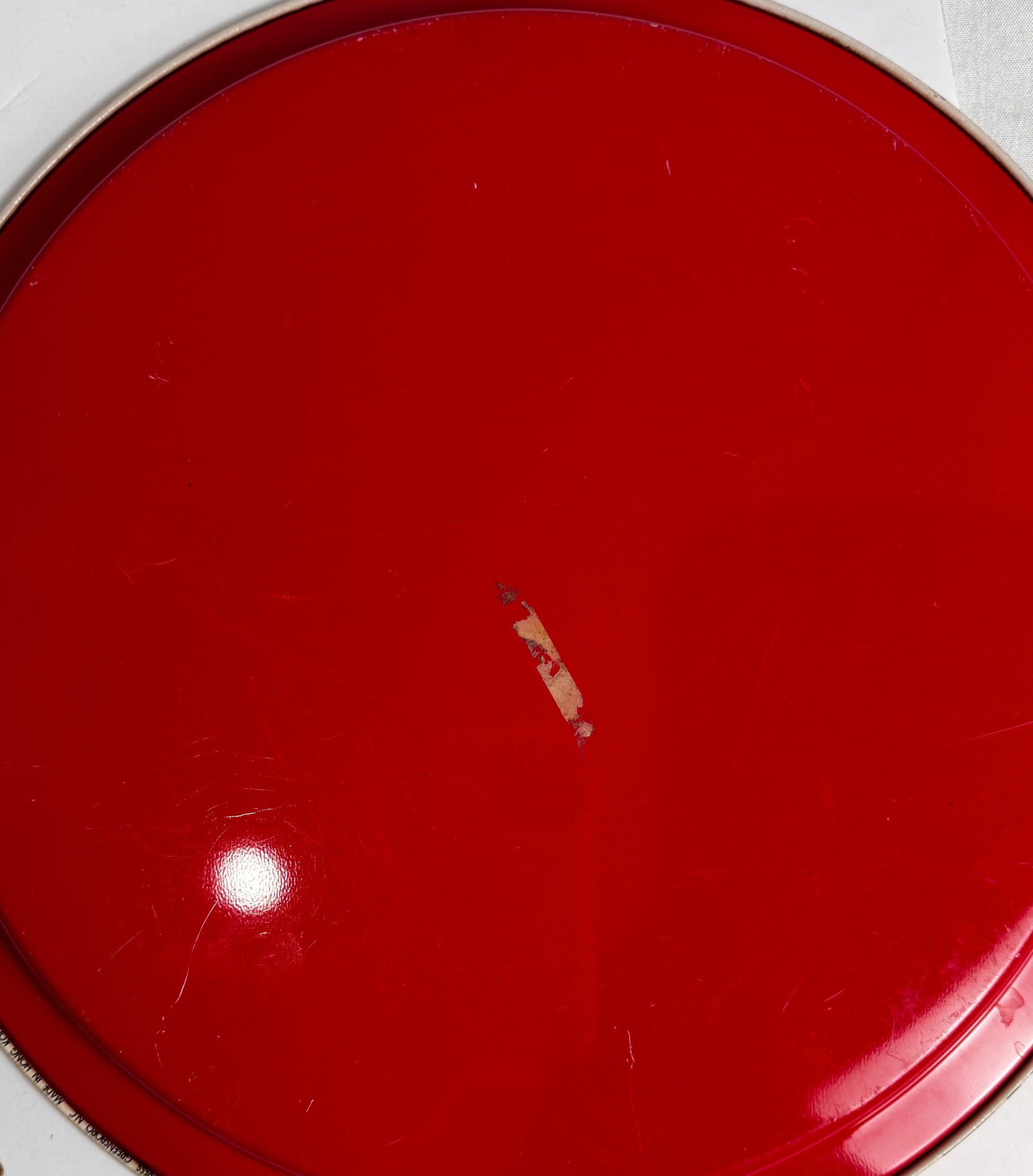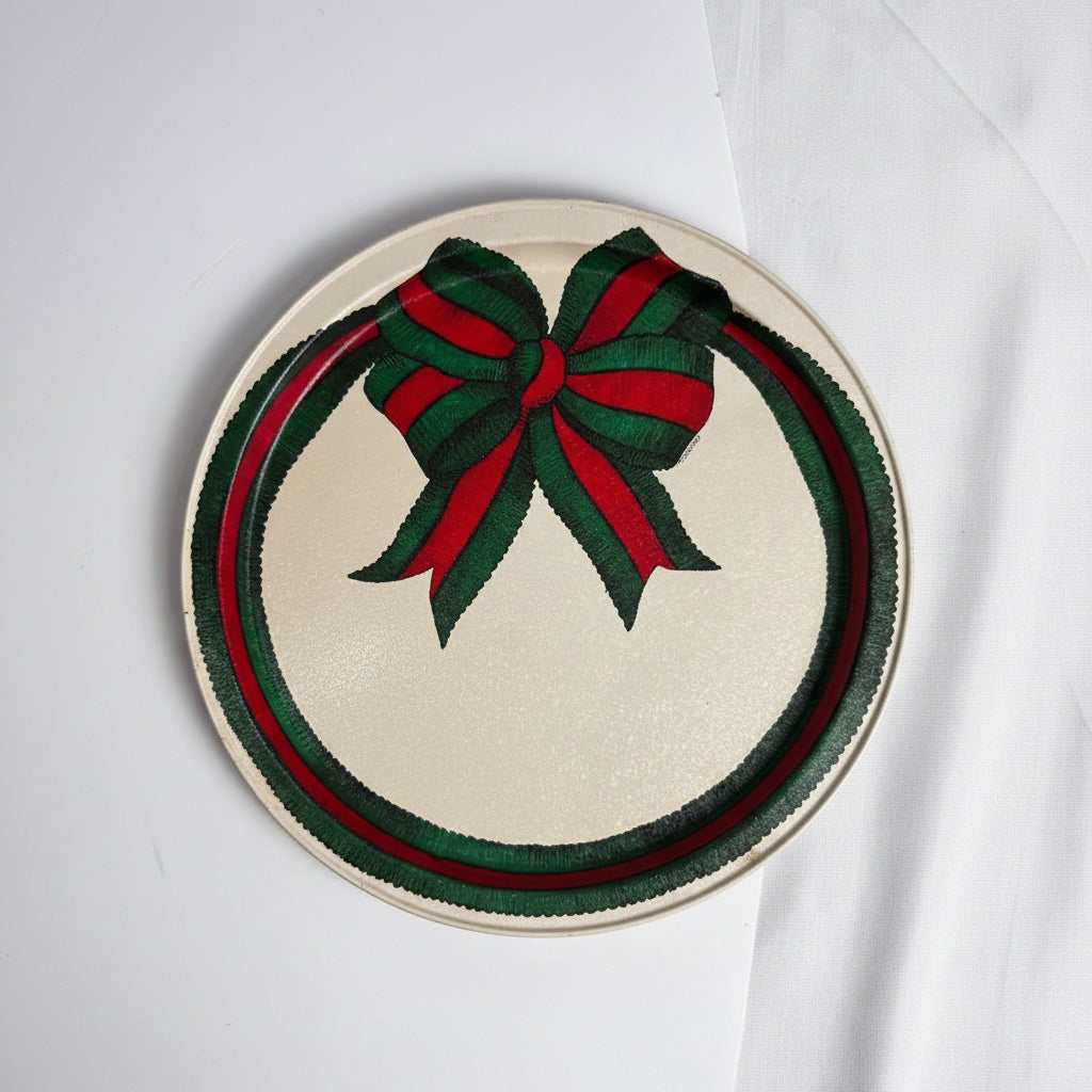 This particular tray, with its classic red and green ribbon bow design, evokes a sense of traditional Christmas celebration. Such items were commonly produced in the mid to late 20th century, a period when decorative tinware and serving pieces with artistic designs saw a surge in popularity. The presence of the artist's signature adds to its collectible appeal, distinguishing it from mass-produced, unbranded items.