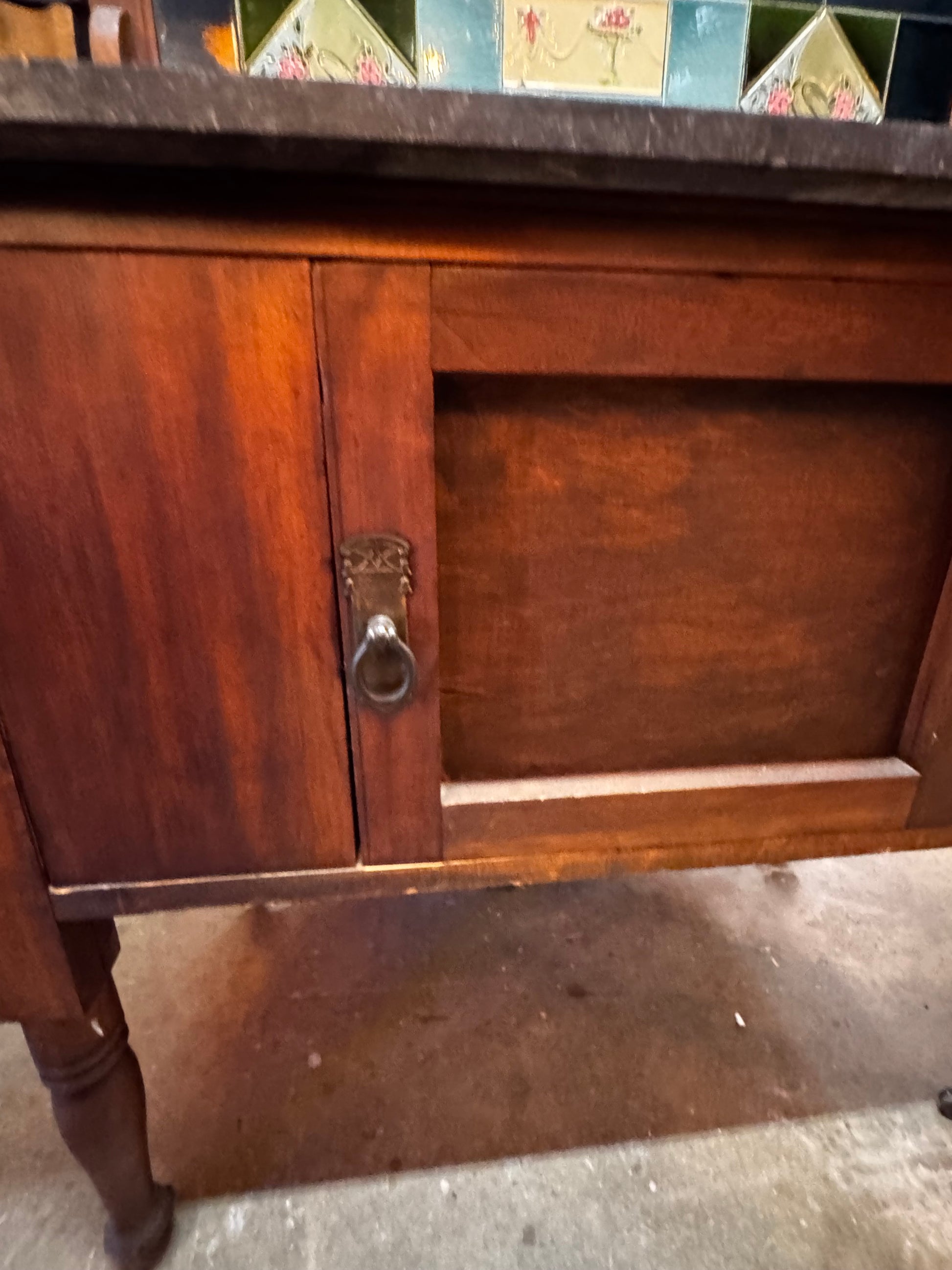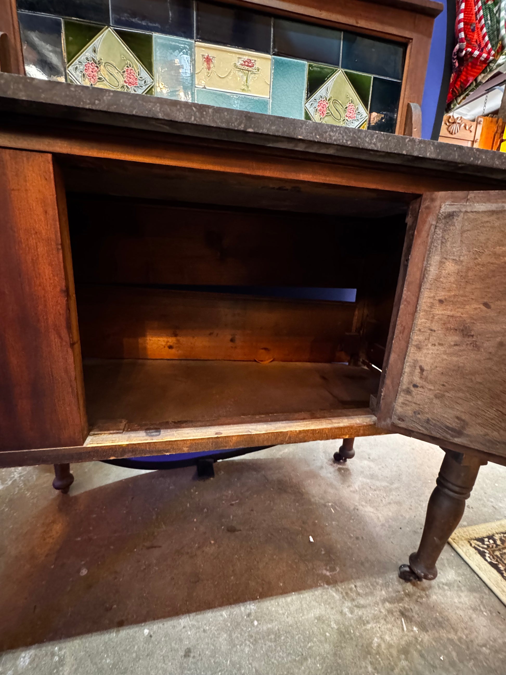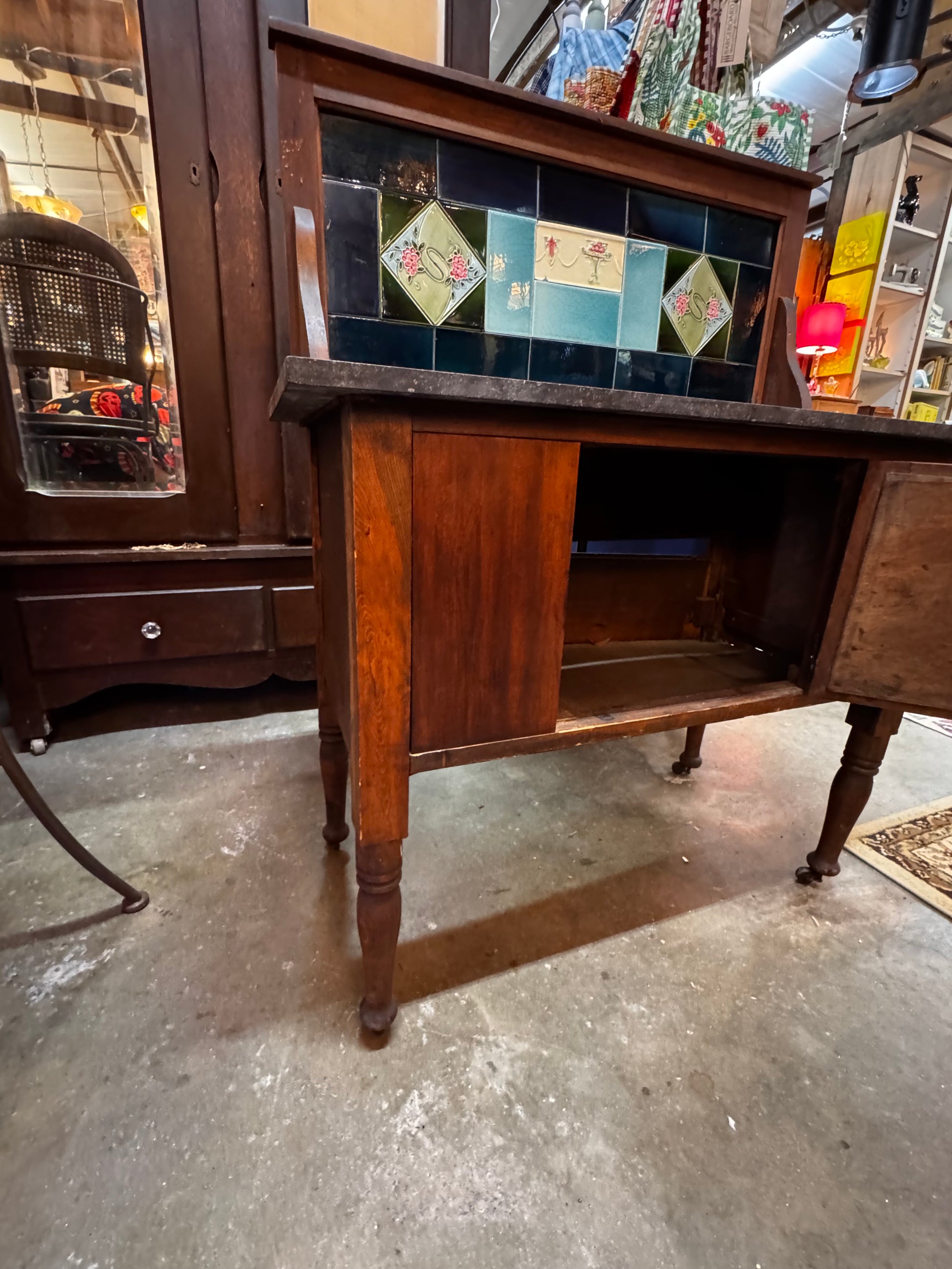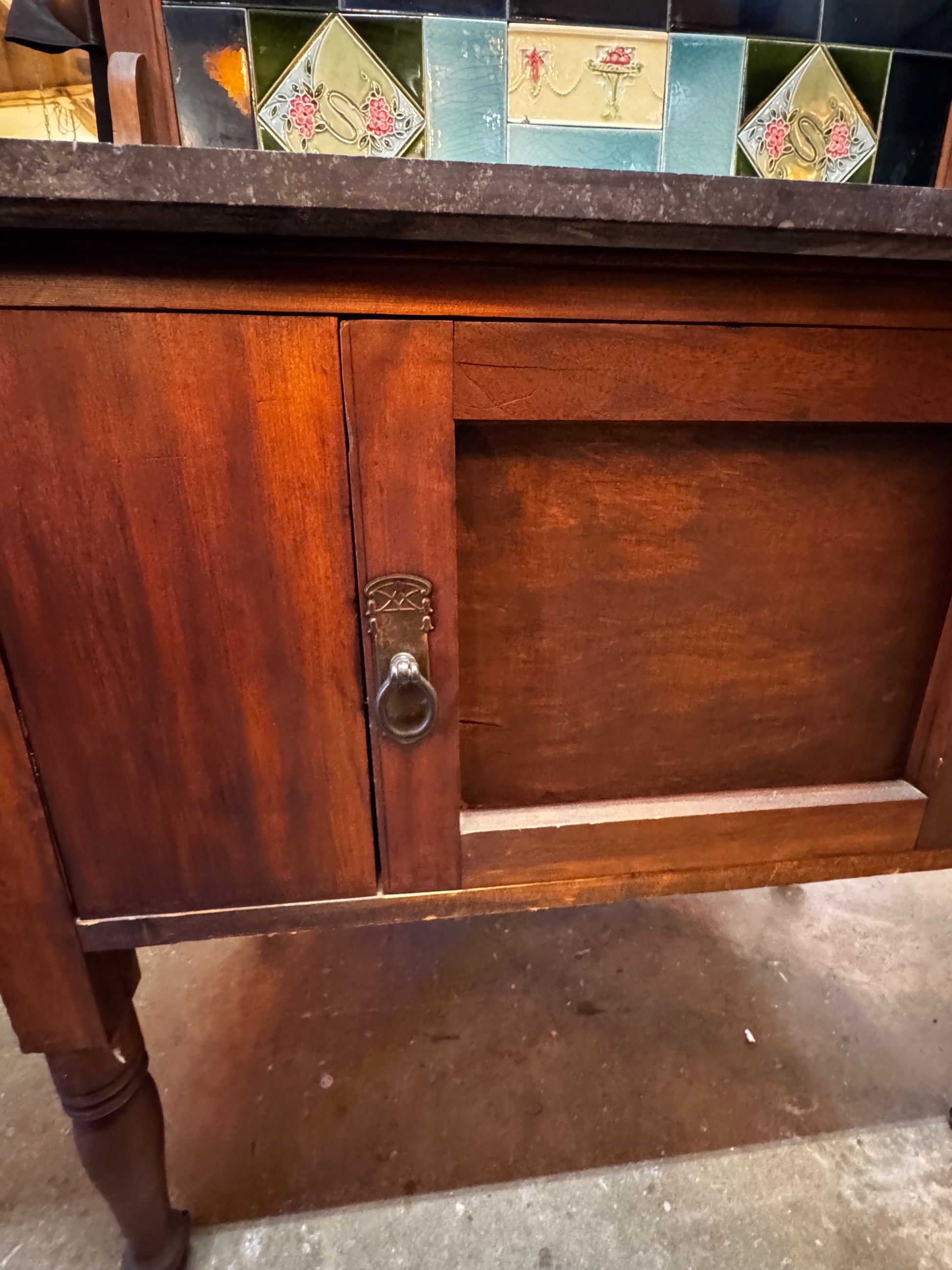 This is an antique washstand or commode, likely from the late 19th to early 20th century, featuring a dark hardwood cabinet with a marble top. It includes a decorative tiled backsplash, with patterns suggesting an Art Nouveau influence. The piece stands on turned legs fitted with original casters, indicating its period and mobility. It shows a natural patina and age-appropriate wear, consistent with a genuine antique.