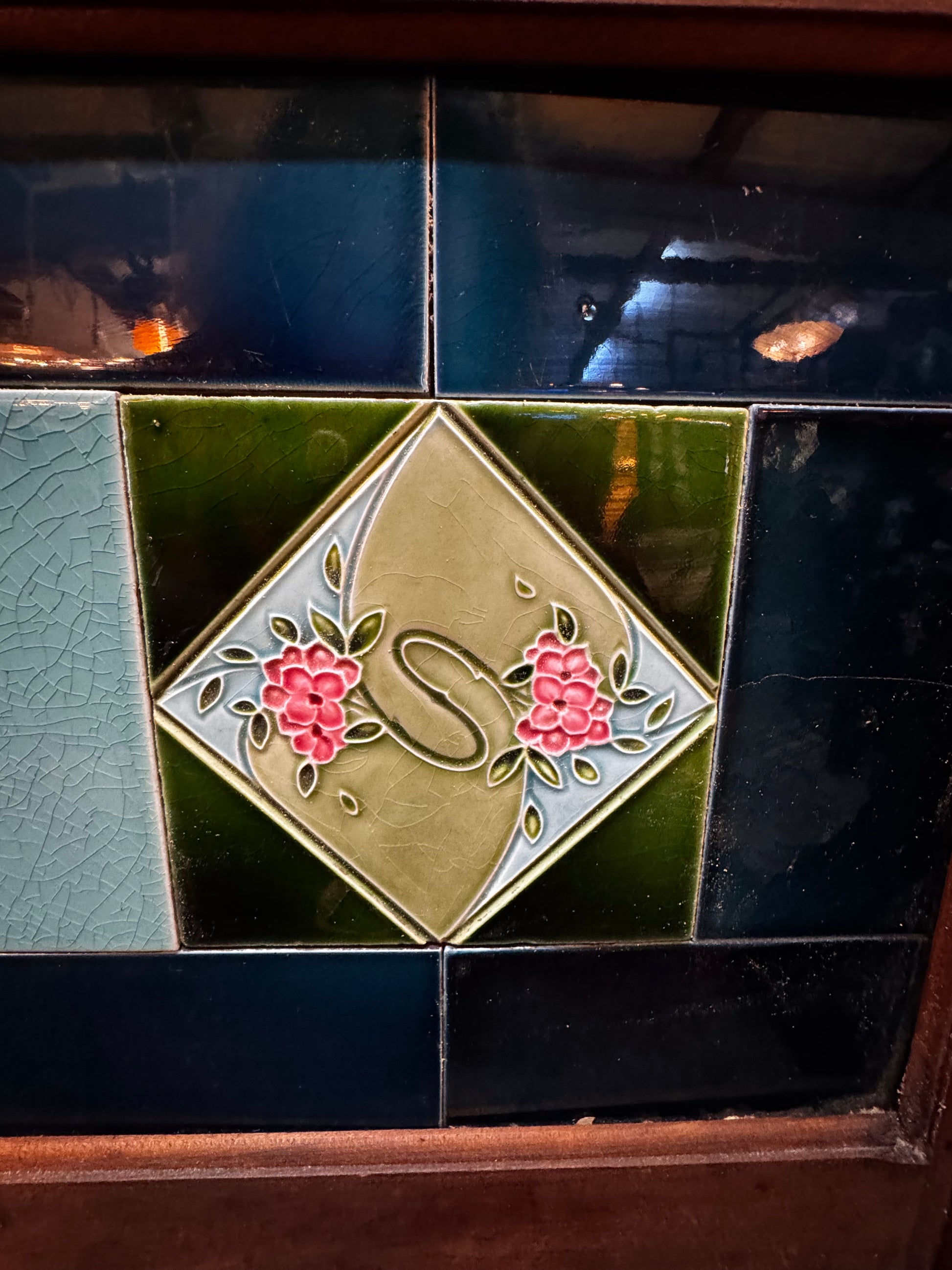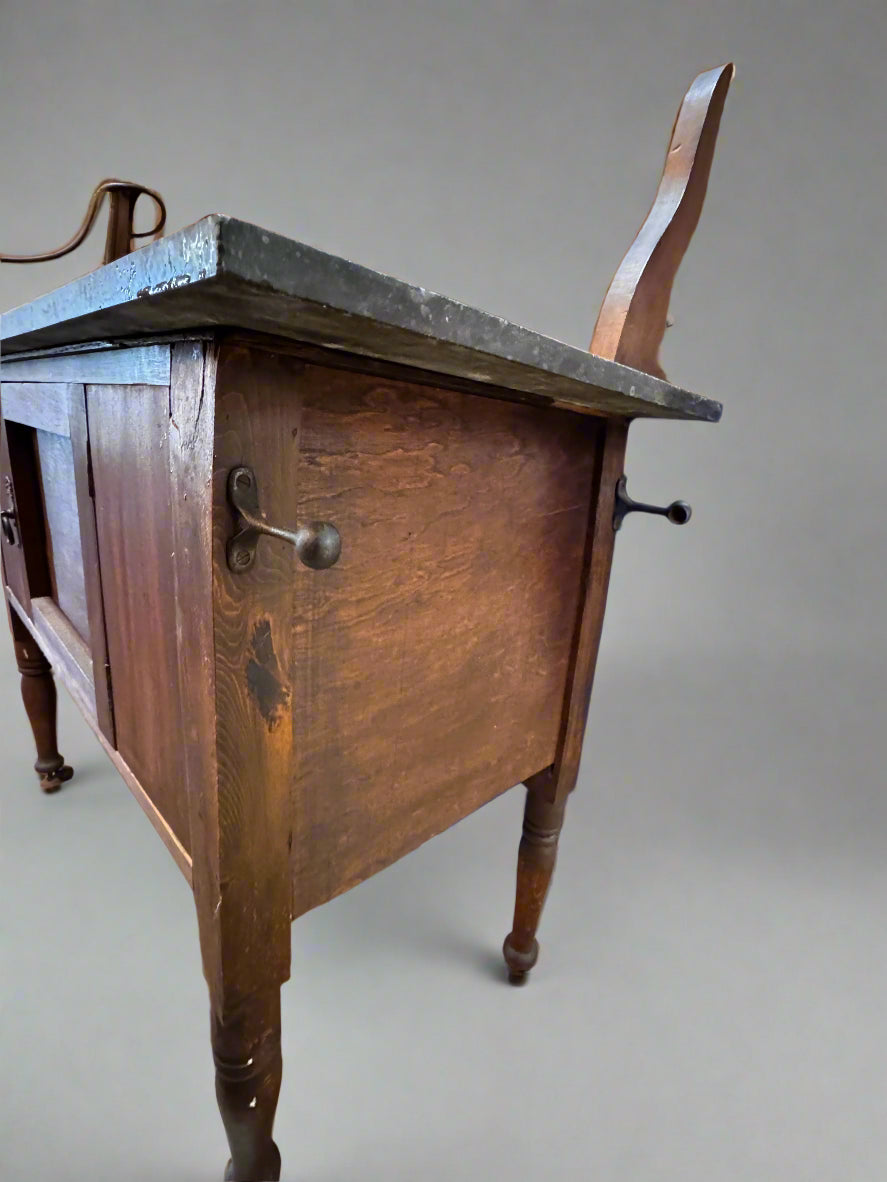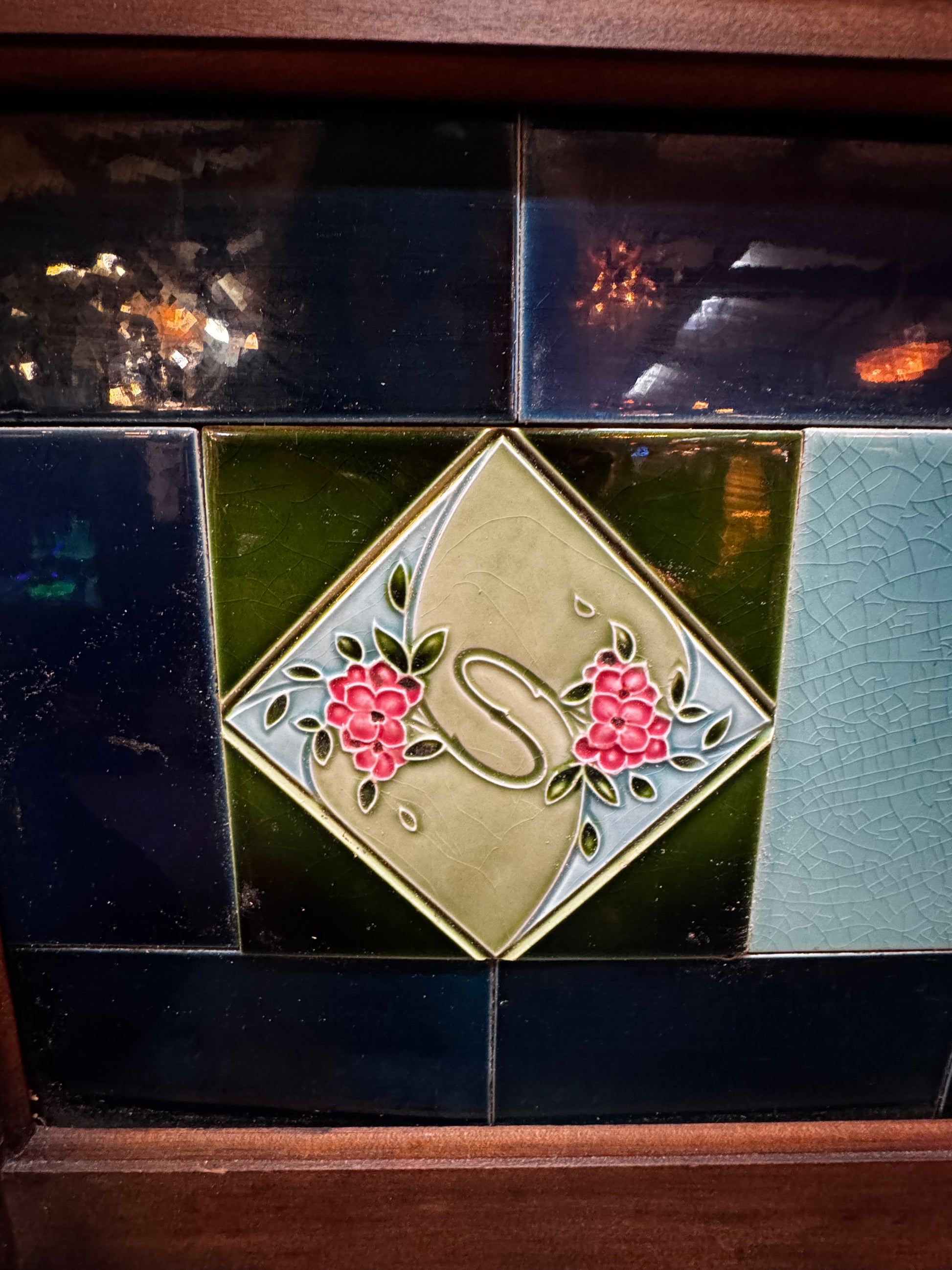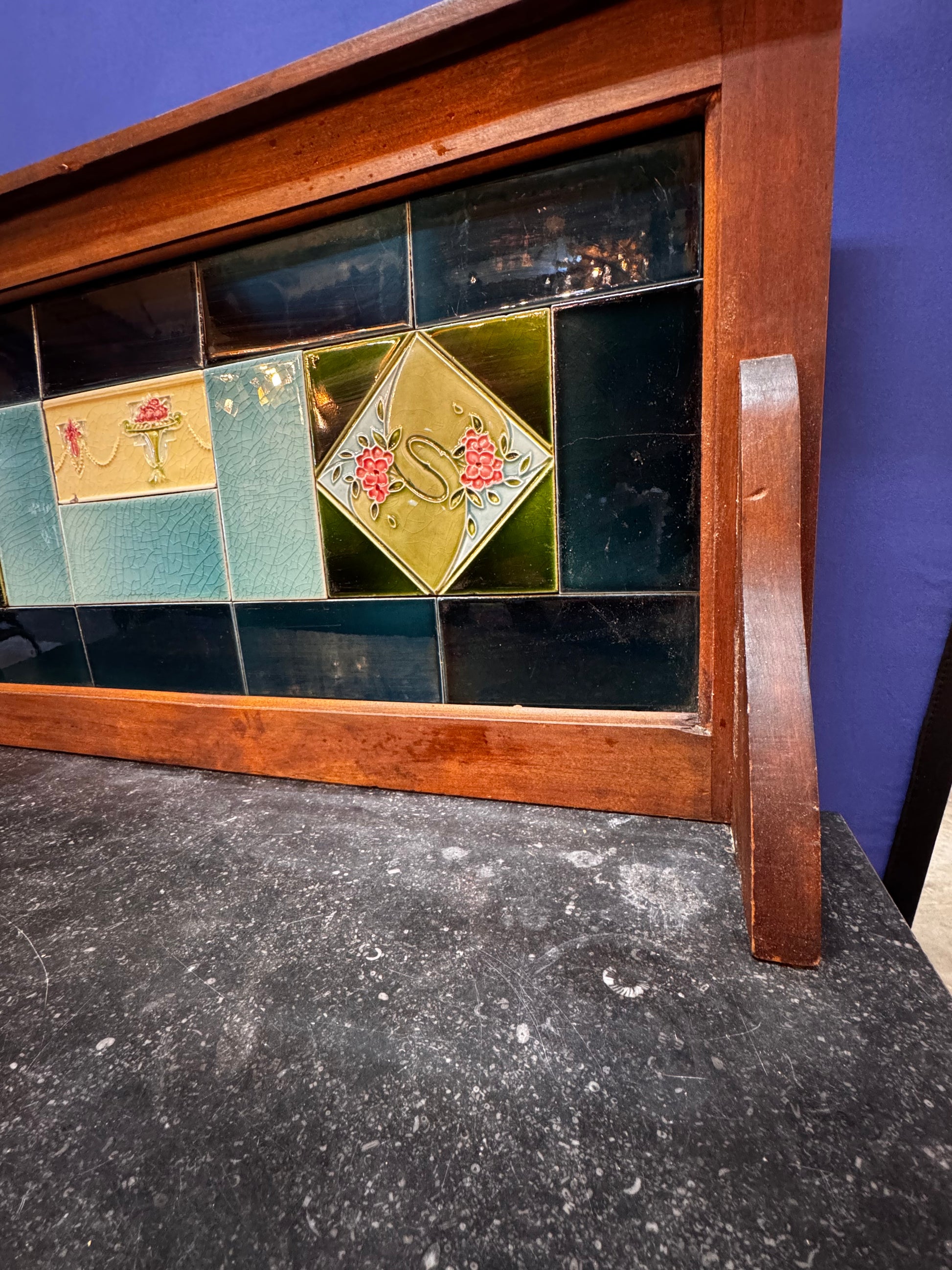 This is an antique washstand or commode, likely from the late 19th to early 20th century, featuring a dark hardwood cabinet with a marble top. It includes a decorative tiled backsplash, with patterns suggesting an Art Nouveau influence. The piece stands on turned legs fitted with original casters, indicating its period and mobility. It shows a natural patina and age-appropriate wear, consistent with a genuine antique.