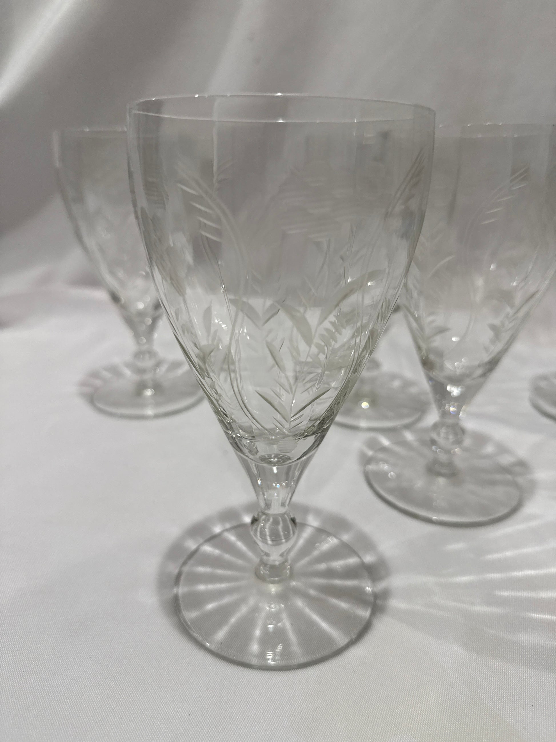 Set of vintage etched stemmed glassware, featuring delicate etched detailing on clear glass bowls. Each piece is finely balanced with a slender stem and wide foot for stability. The etched design adds an elegant decorative touch, reflecting classic mid-20th century glassmaking style