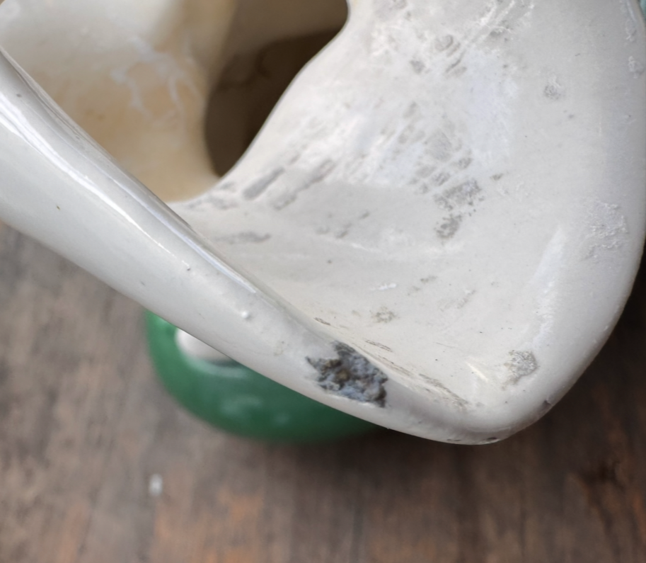 This is an authentic Vintage Figural Ceramic Planter from the Mid-Century era, estimated to be manufactured between the 1940s and 1950s. The piece features a white glazed female figurine attached to a separate, glossy dark green oval planter bowl, typical of collectible American and Japanese ceramics (e.g., Napco, Lefton, Hull, Shawnee). Historical Note: The previous owner had hidden a medal of St. Gerard Majella (the patron saint of fertility and expectant mothers) inside the bowl. Condition Note: The white figurine has a visible chip on the lower edge of the flowing garment (as shown in image), and the green bowl shows light residue. The item is sold as a decorative Mid-Century Planter.