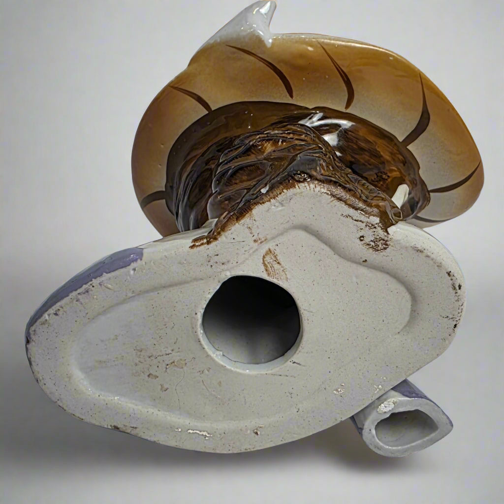 Bring timeless charm and elegance to your collection with this vintage porcelain figurine of a blonde lady wearing a wide-brimmed hat. Beautifully hand-painted, this piece features delicate detailing including soft facial features, bright red lips, and a refined pose with her hand gracefully raised to her face. Her wide golden-yellow hat with a blue ribbon highlights the craftsmanship and artistry of mid-20th century ceramic design.