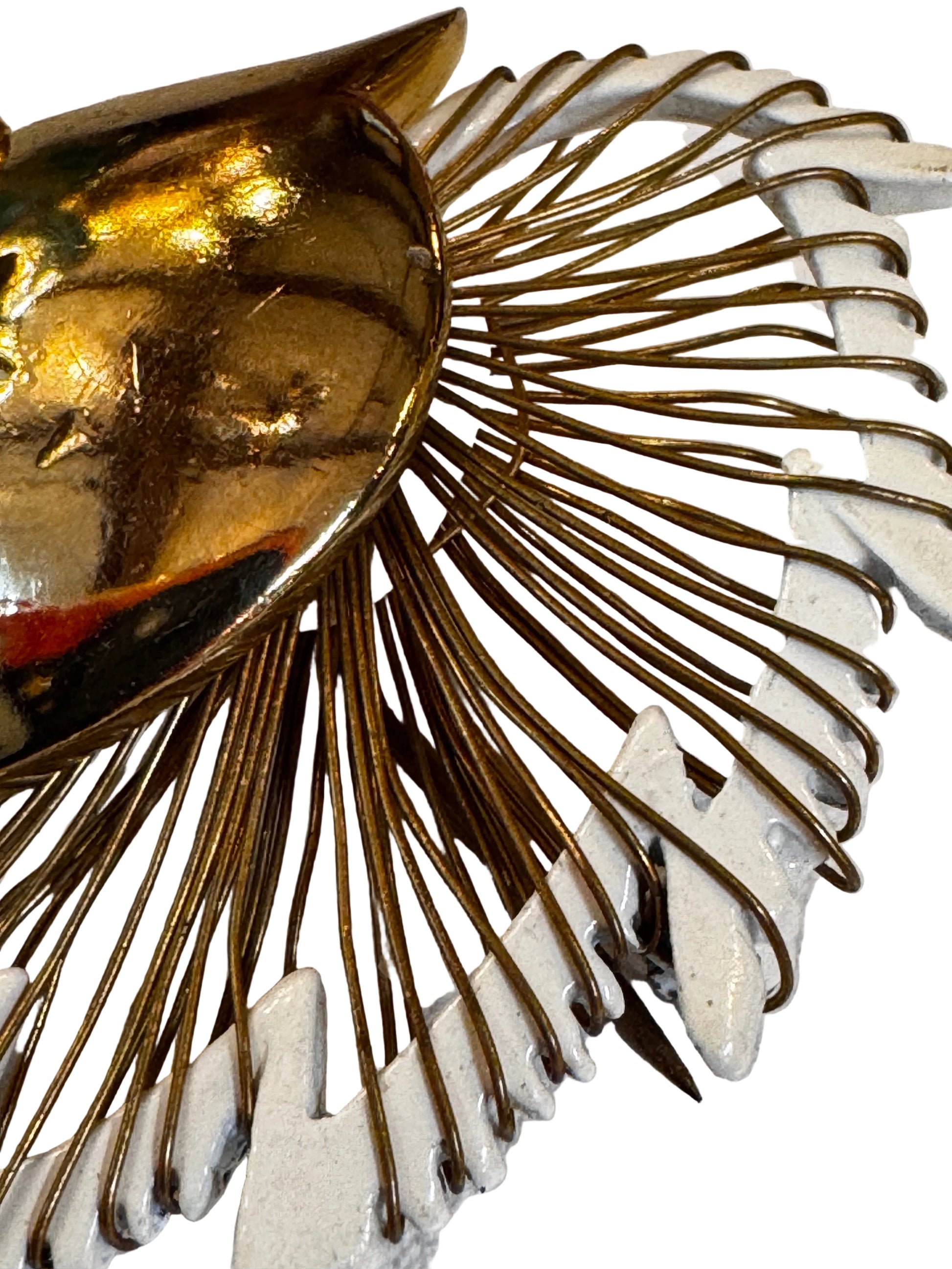 A bold 1980s statement piece, this figural unicorn brooch features a polished gold-tone head and a multi-layered white enamel mane. The reverse reveals intricate hand-wiring, a hallmark of high-quality artisan costume jewelry from this era.