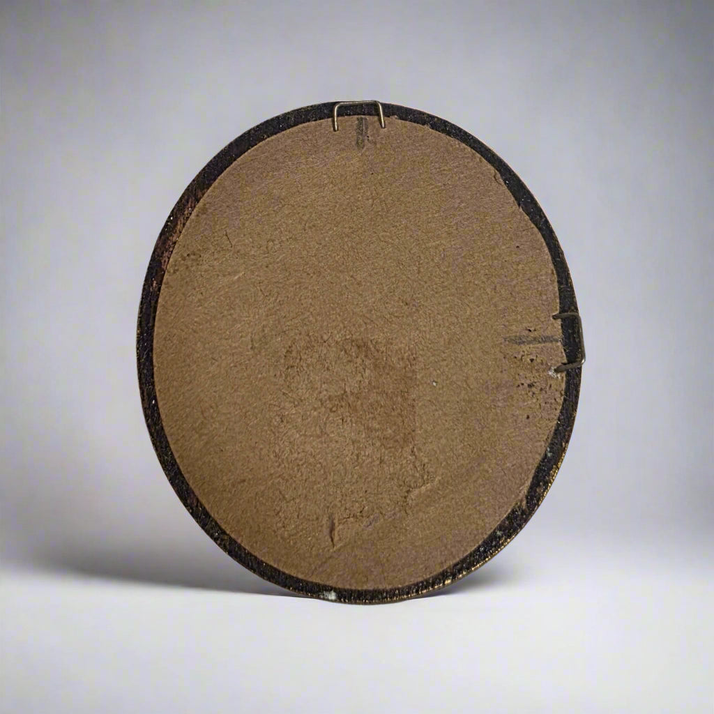 This vintage mid century cameo features a woman in a blue & white dress with a gold oval frame.