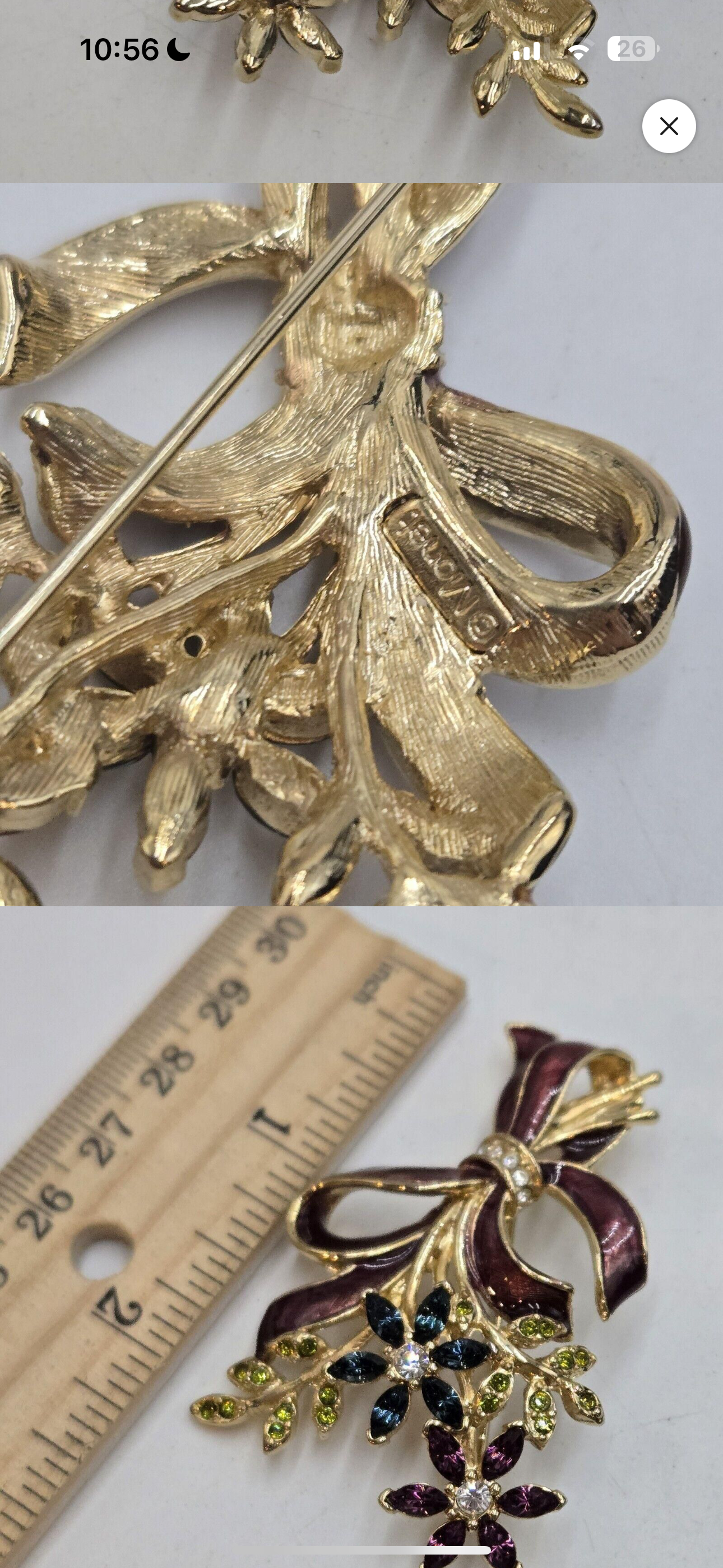 Monet Purple and green rhinestones and ename brooch. Gold tone. Mardi Gras Pin