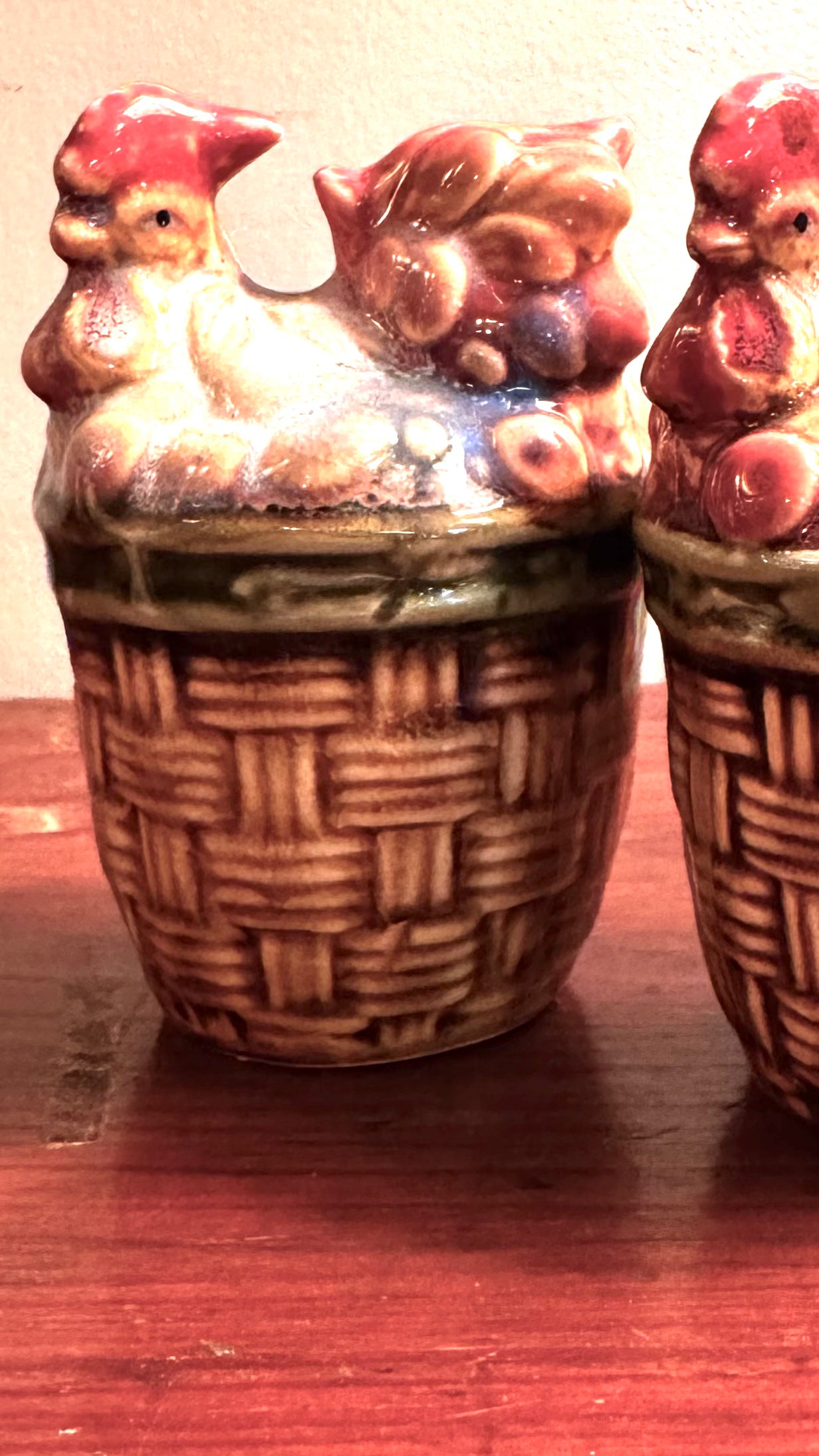 Hen and chicken motifs were particularly common, reflecting the agricultural interests of many households. These shakers often came in sets, with the hen 'nesting' over a basket-shaped base. The use of bright glazes and molded details further enhanced their appeal as decorative collectibles.