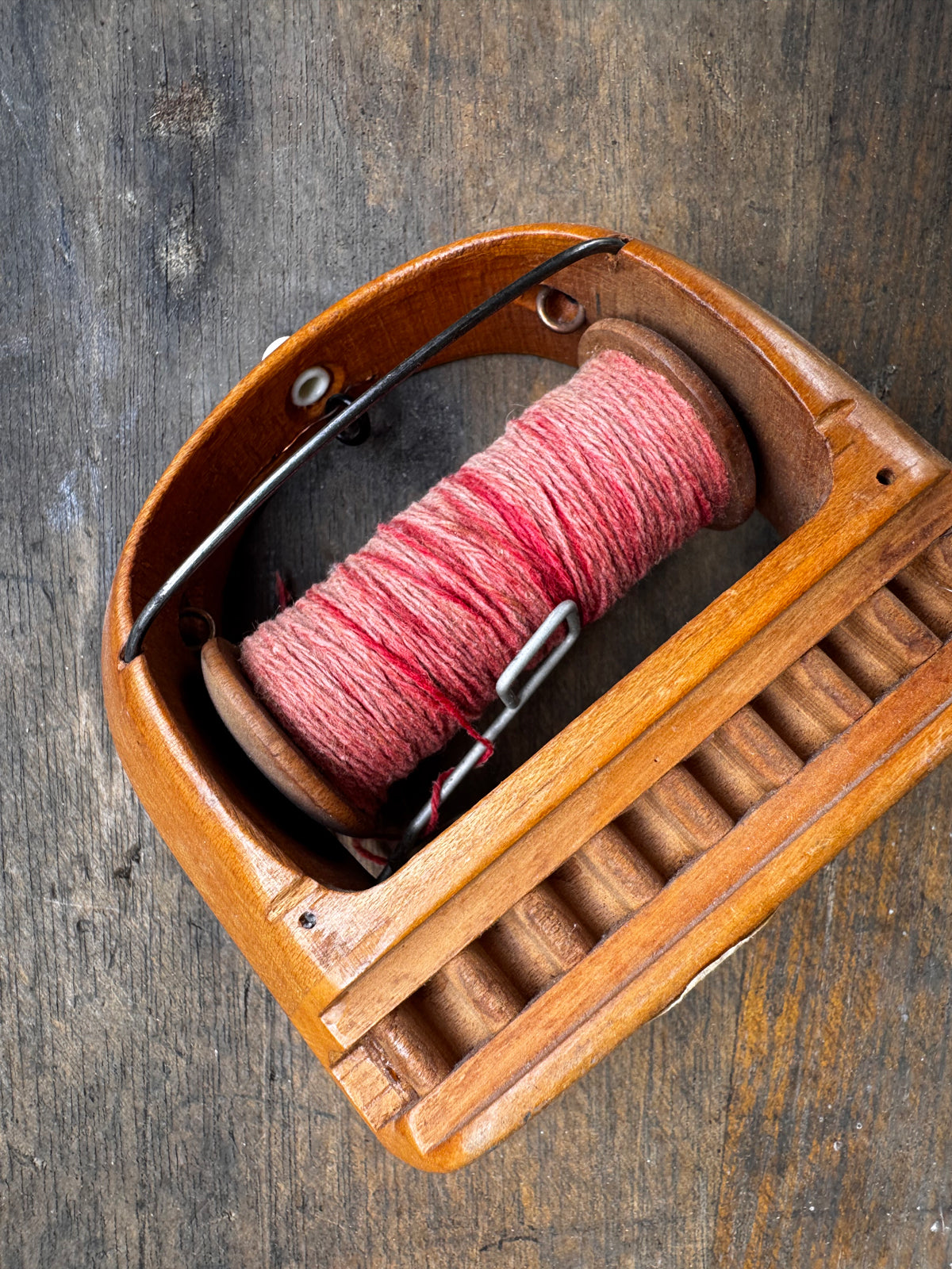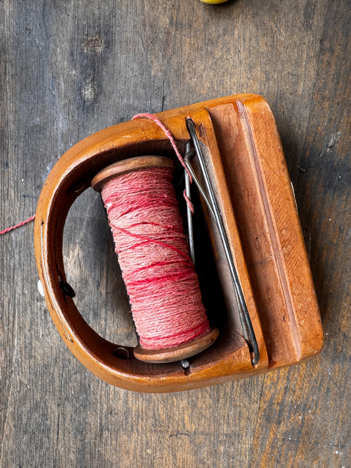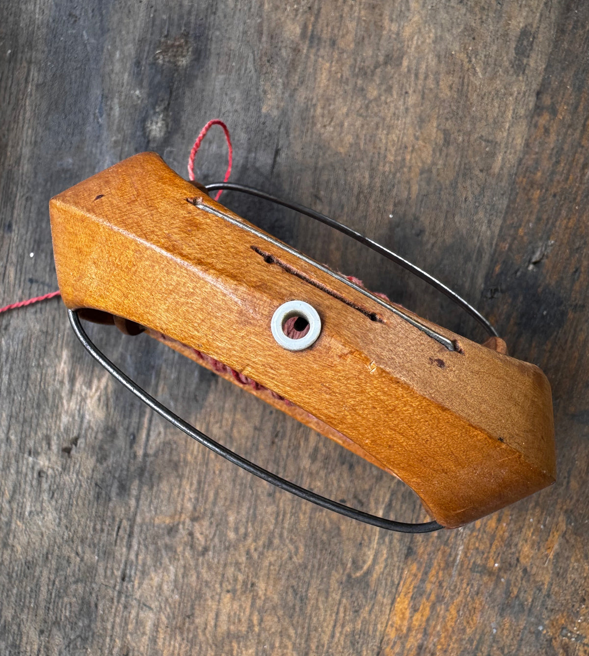 Mechanism: Features a hollowed-out central cavity designed to house a removable bobbin or spool, which is currently included and wound with pink-toned thread. The bobbin is secured by two exterior metal wire prongs (springs) and the thread exits through a metal eyelet (grommet) at the tip of the shuttle.