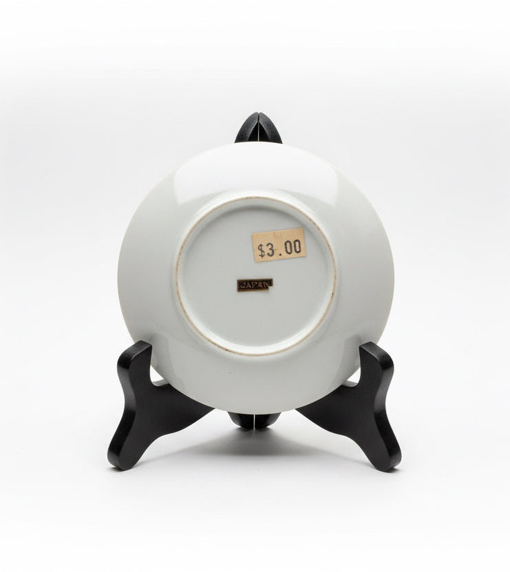 This vintage New Orleans souvenir plate is a significant historical collectible because it features the Rivergate International Exhibition Center, a lost mid-century landmark that stood only from 1968 to 1995. Produced between 1975 and the early 1990s—confirmed by the presence of both the Rivergate and the Superdome—this porcelain piece was made in Japan and retains its original foil label and vintage $3.00 price sticker. Featuring a gold-tone rim and iconic vignettes of Bourbon Street and the French Market, it serves as a nostalgic time capsule of a specific era in Louisiana's architectural history.