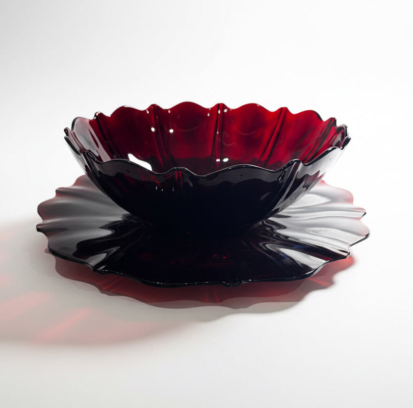 matching two-piece serving set in the "Oyster and Pearl" pattern by Anchor Hocking. Produced from 1938–1940, these pieces feature a vibrant ruby red glass with a textured scalloped design.