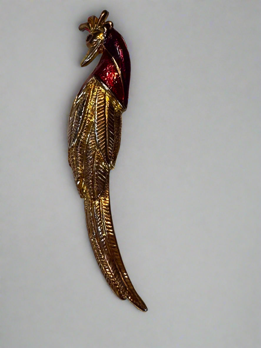 Vintage peacock brooch with gold-tone and red enamel finish. Features a detailed, textured feather design and a secure pin-back closure. No visible markings.
