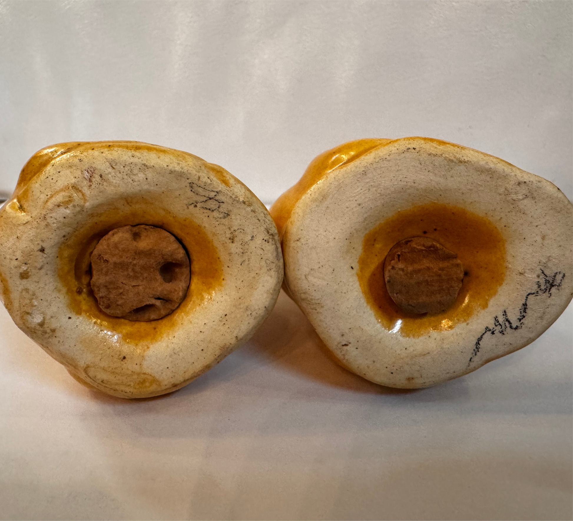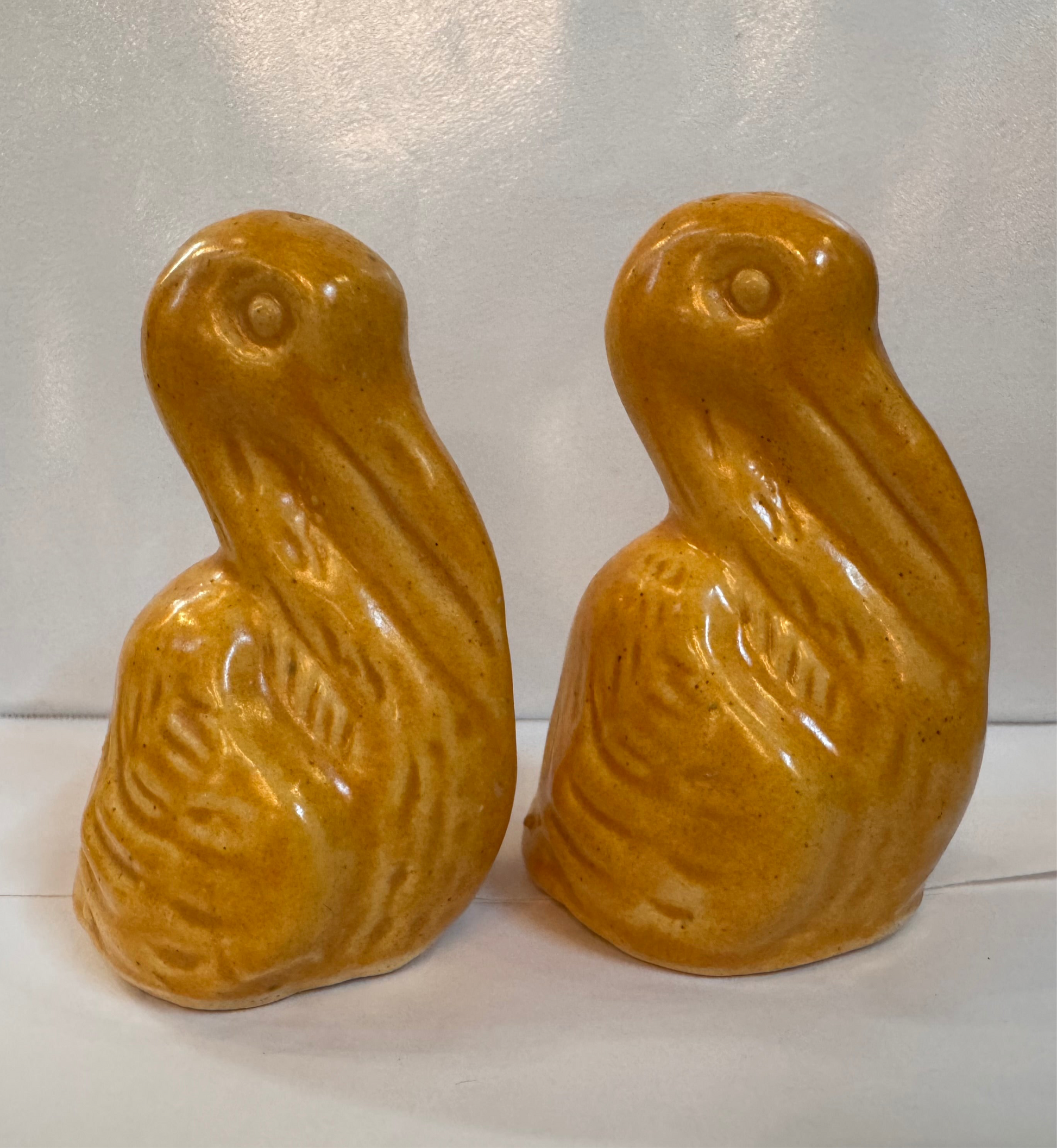 This charming pair of vintage ceramic pelican salt and pepper shakers from the mid-century features a high gloss crackle glaze finish, making them a desirable piece for collectors of figural ceramics.