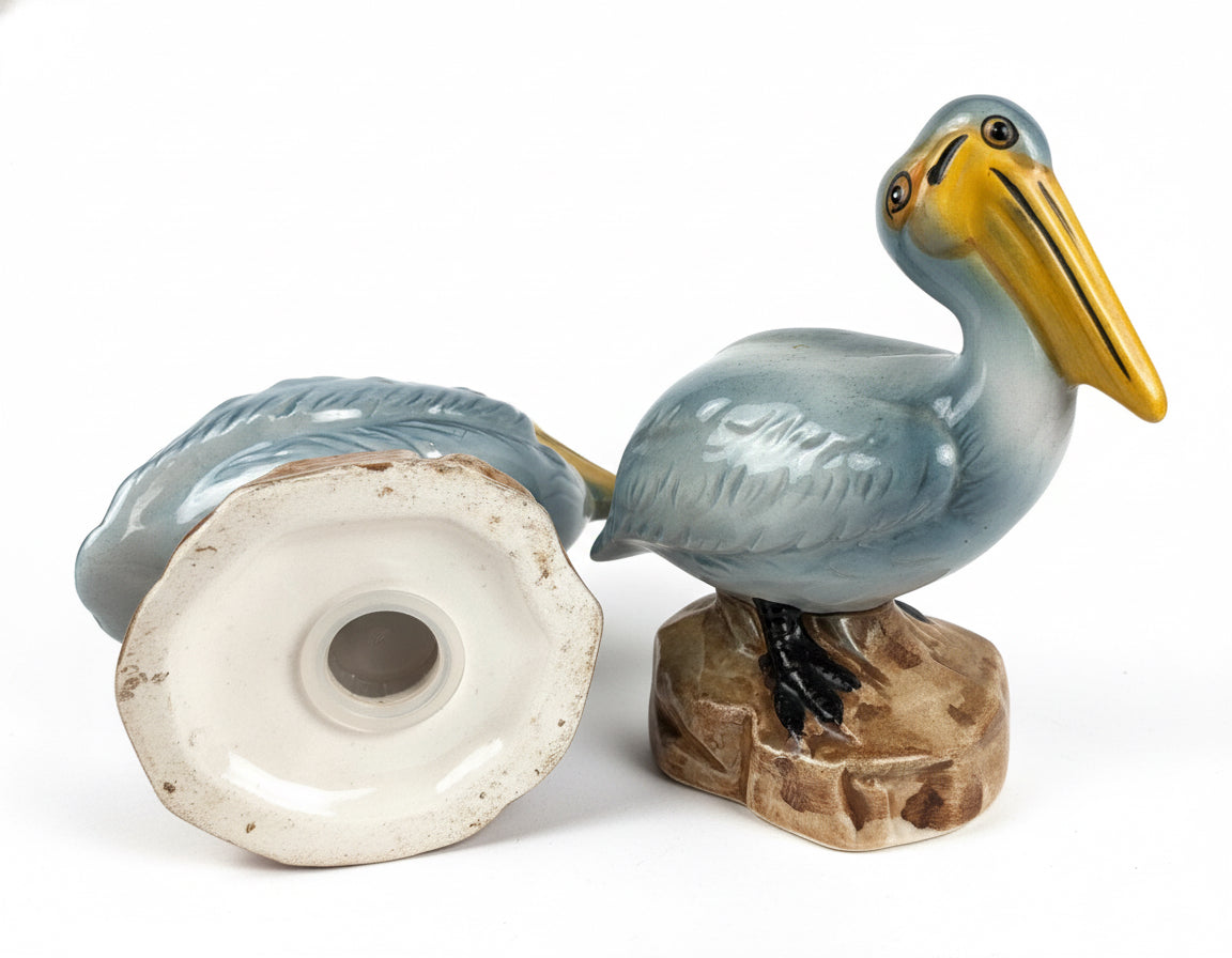 This is a pair of vintage ceramic salt and pepper shakers shaped like pelicans perched atop brown, rocky bases, measuring approximately 3 inches tall. Each shaker features a gray-blue body and a distinctly bright yellow-orange beak. Both birds have a matching design with two shaker holes on their backs, and one image confirms the set includes plastic stoppers for easy filling. These pieces fall into the collectible category of nautical or souvenir ceramics.