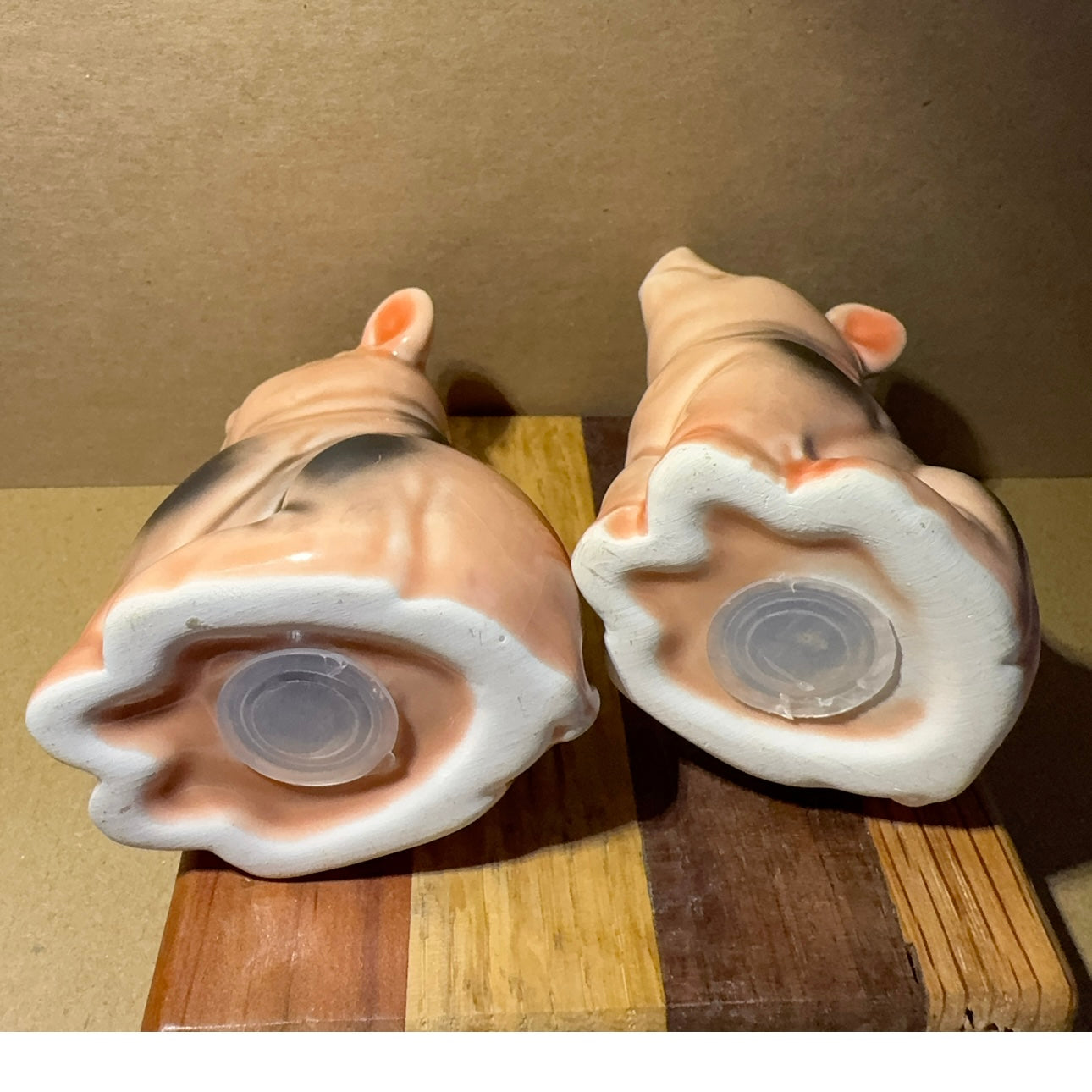 Animal-shaped shakers, like these piggies, were especially common and beloved. They were often hand-painted and designed to be charming and collectible. While not necessarily high-value antiques, they are appreciated for their nostalgic appeal and the craftsmanship involved in their creation. Many collectors seek out these vintage shakers to complete their collections and add a touch of retro flair to their homes.